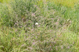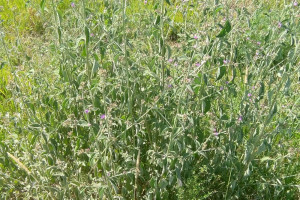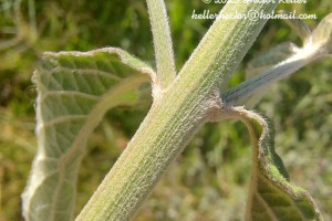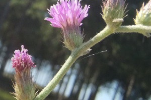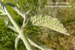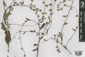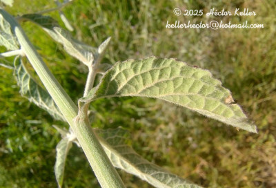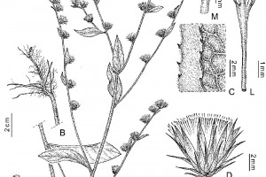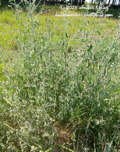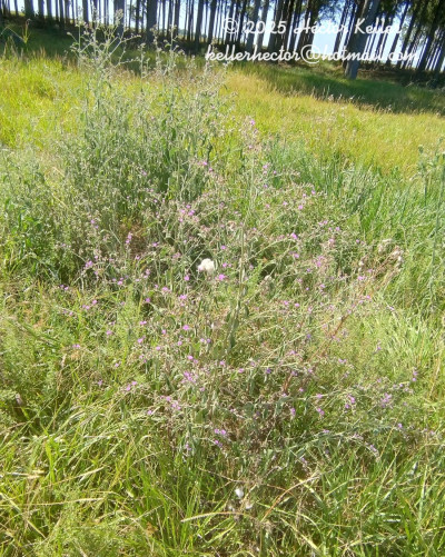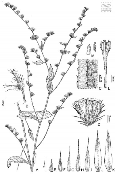 Hierbas anuales, erectas, de 30-60(-120) cm de alto, con raíz pivotante y tallos estriados, pubescentes, con pelos cortos y aplastados, hojosos hasta la inflorescencia. Hojas sésiles, ovadas u oval-lanceoladas, de 5-11 × 2-3,5 cm, atenuadas hacia la base en un breve pseudopecíolo, agudas en el ápice, aserradas o denticuladas, membranáceas, haz algo áspera con pelos finos con base prominente y persistente, estrigosa, envés cubierto de pelos sedosos rectos. Capítulos sésiles, axilares, reunidos en cincinos laxos, axilares, que se disponen en una panícula terminal amplia, hasta de 40 cm de largo; brácteas de la inflorescencia foliáceas, oval-lanceoladas, progresivamente más cortas hacia el ápice de las ramas, de 1,4-2,1 cm de largo. Involucro acampanado, de 6-8 mm de alto; filarios en 5-6 series, de 3,7-6,3 × 0,6-1 mm, los externos linear-lanceolados, a veces algo recurvados, los restantes lanceolados, acuminados, escariosos, lustrosos, pubescentes, con pelos adpresos, dorso rosado o púrpura. Flores 21-23; corolas purpúreas o liláceas de 6,3-7 mm de largo, glabras. Aquenios turbinados, de 1-1,5 mm de largo, costados, pubescentes. Papus blanco, la serie interna de 5-6 mm de largo, la externa de 0,7-1 mm de largo.