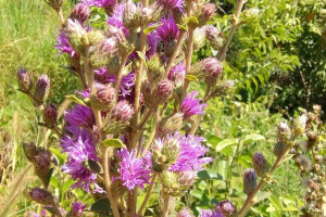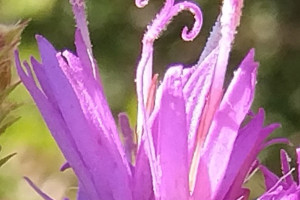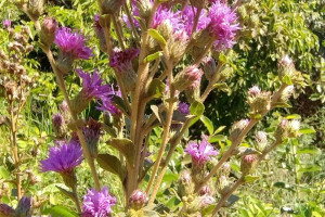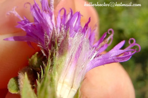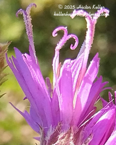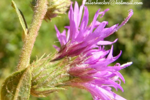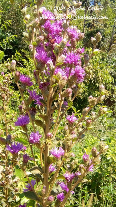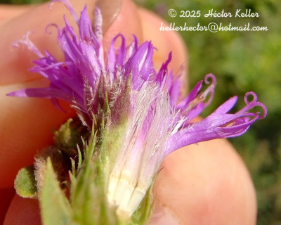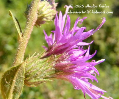 Subarbustos erectos, xilopodíferos, de 1-2,5 m de alto, con tallos hojosos, costados, glanduloso-pubescentes. Hojas sésiles, ovadas, ovado-lanceoladas, obovadas o lanceoladas, de 5-10 × 2-4 cm, redondeadas, sub-auriculadas o afinadas en la base, agudas en el ápice, aserradas, denticuladas o enteras hacia la base, coriáceas o subcoriáceas, escabrosas, con pelos glandulares con la base pluricelular corta, rígida y una célula apical larga, delgada y frágil. Capítulos sésiles, reunidos en una amplia y vistosa panícula de cincinos hojosos; brácteas de la inflorescencia de forma similar a las hojas, decreciendo en tamaño hacia el extremo de los cincinos. Involucro acampanado, de 10- 11 × 9-10 mm; filarios dispuestos en 4-6 series, los internos oblongo-lanceolados, con el dorso glabro o subglabro y pelos muy largos en el margen, los externos linear-lanceolados, recurvados. Flores 20-30; corolas violáceas de 9-14 mm de largo. Aquenios de 3,6-4 mm de largo, laxamente pubescentes. Papus blanco, cerdas internas de 7-8 mm de largo, la serie externa muy corta y aplanada.