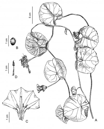 Plantas volubles; tallos estriados, glabros o cortamente pubescentes. Hojas enteras, oblongas u ovadas, de 4-15 × 1-8 cm, acuminadas, base cordada, truncada o hastada, envés con pubescencia esparcida o densa, haz glabra o glabrescente. Inflorescencias umbeliformes pauci- a multifloras; pedúnculos pubescentes de 1-7 cm de largo; brácteas florales lanceoladas, caducas. Flores con sépalos subiguales, elíptcos u orbiculares, de 5-8 mm de largo, cóncavos, ápice emarginado, glabros o con pelos esparcidos, los internos con bordes escariosos; corola acampanada, amarilla, glabra, ca. 3,5 cm de largo, áreas mesopétalas con bandas oscuras; ovario glabro o algo piloso en el ápice, 2-locular. Cápsula ovoidea, glabra o pubescente en el ápice, 2-locular, 4-valvada, de 8 mm de diám. Semillas ca. 5,5 mm de diámetro, pardas, densamente pubescentes, con pelos más largos y patentes en los bordes.