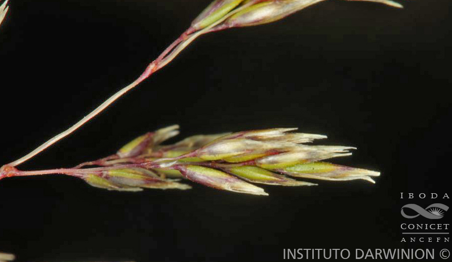 Plantas perennes, cespitosas; cañas de 6-25(-30) cm de alto, exertas del césped, excepcionalmente subincluidas, glabras; vainas glabras o pilosas en los márgenes, brillantes, las de las cañas floríferas mas ensanchadas; lígulas de (0,8-)1,5-2(-4,5) mm de largo, membranáceas, subtrígonas, ápice obtuso, hendido, margen ciliado, dorso finamente piloso, decurrentes con la vaina; láminas de 1-6 cm de largo, erectas, alineadas con las vainas, conduplicadas, ápice obtuso o agudo, navicular, envés glabro o escabriúsculo, haz piloso-lanoso, sin pulvínulo basal desarrollado. Inflorescencia una panoja laxa, pauciflora, de 1-5 cm de largo, ramificaciones glabras, desnudas en la base, a veces algo contraidas, pedicelos glabros o escabriúsculos. Espiguillas de (3,2-)3,5-4,8(-5) mm de largo; glumas subiguales, obtusas o agudas, amarillentas, a veces con tintes violáceos en el dorso, la inferior 1-nervia, la superior 3-nervia, quilla glabra o poco escabriúscula; lemma de (2,8-)3,5-4,5 mm de largo, 5-nervia, nervios notables en el tercio superior, ápice 2-4-lobulado, con mucrón subapical o arístula de 0,3-1(-2) mm de largo, inserta en el tercio superior del dorso, que no supera la longitud de las glumas; pálea 2-nervia, de (1,4-)3,2-3,5 mm de largo, ápice brevemente 2-denticulado; callo breve, redondeado, piloso, pelos cortos menores de 1 mm de largo; raquilla de (1-)1,4-2,2 mm de largo, pilosa, los pelos alcanzan el ápice del antecio o lo sobrepasan; lodículas 2, membranáceas, 2-lobuladas, de 0,3-0,4 mm de largo; estambres 3, anteras de 1,4-1,7(-2,4) mm de largo; gineceo con dos estilos cortos y estigmas breves plumosos; cariopsis de 2 mm de largo, comprimida lateralmente, embrión breve, ? de su longitud, surco ventral estrecho, poco profundo, hilo oval.