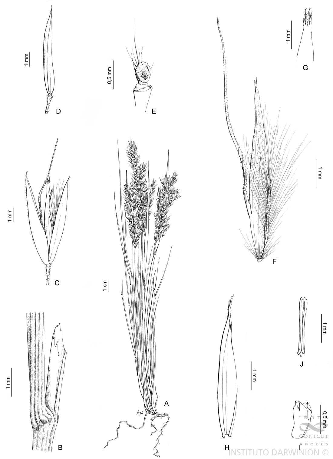 A. Planta. B. Región ligular. C. Espiguilla, vista lateral. D. Gluma superior. E. Artejo inferior de la raquilla. F. Antecio, vista lateral. G. Ápice de la lemma. H. Pálea. I. Lodículas. J. Estambre.