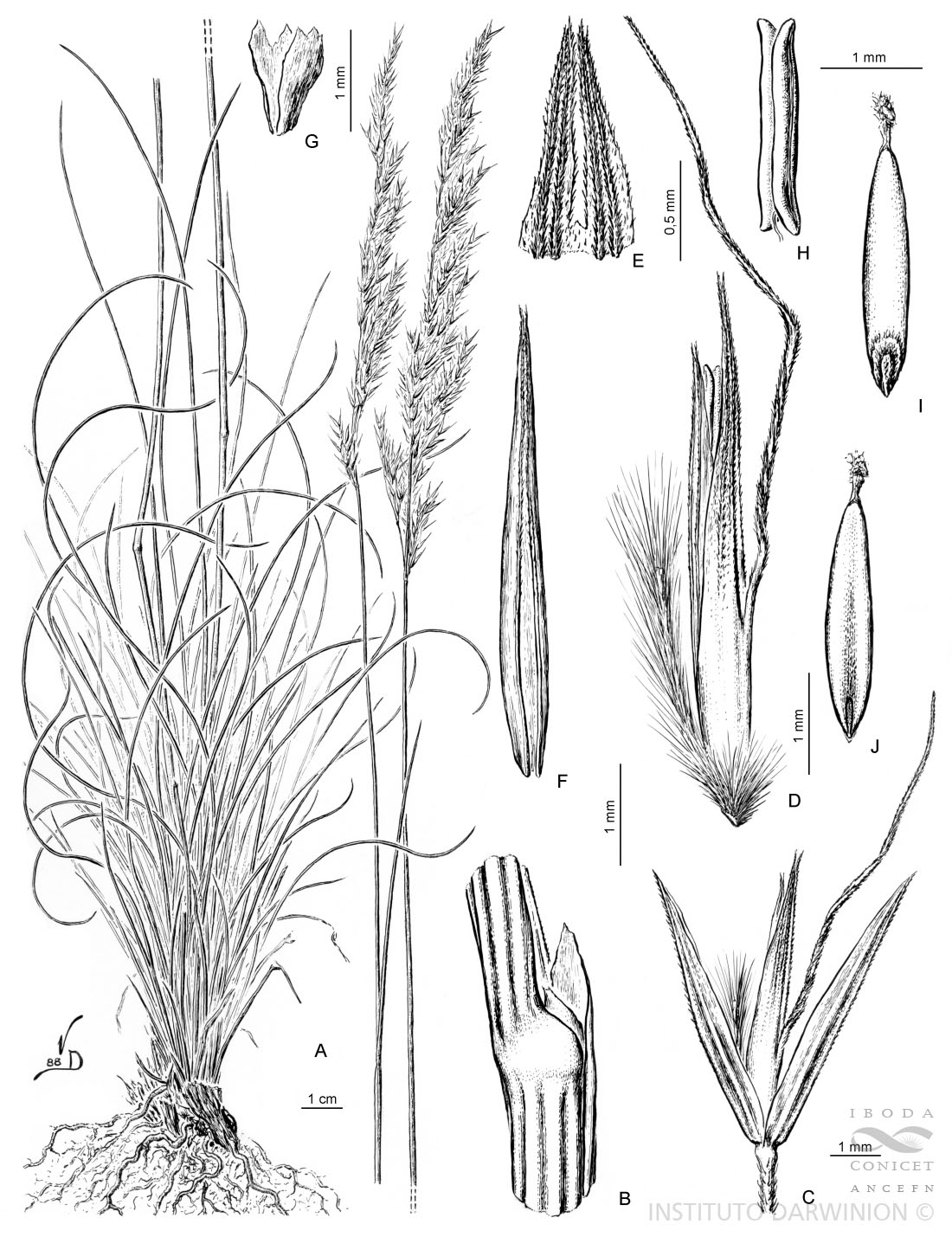 A. Planta e inflorescencias. B. Región ligular. C. Espiguilla, vista lateral. D. Antecio, vista lateral. E. Ápice de la lemma. F. Pálea, vista dorsal. G. Lodículas. H. Estambre. I. Cariopsis, vista escutelar. J. Cariopsis, vista hilar.