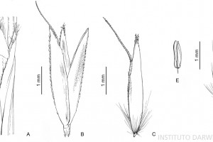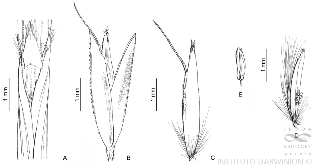 A. Región ligular. B. Espiguilla, vista lateral. C. Antecio, vista lateral. D. Pálea, raquilla y callo, vista lateral. E. Estambre.