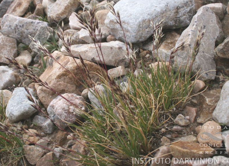 Plantas cespitosas; cañas de (3-)6-25(-37) cm de altura, erectas, césped denso alcanzando ½ de la longitud de las mismas; vainas glabras, brillantes; lígula de (1,2-)1,6-3,2(-3,8) mm de largo, membranácea, subtrígona, ápice redondeado, eroso; láminas de de (1,5-)2,5-10(-14) cm de largo, conduplicadas, filiformes, rígidas, curvadas, márgen ciliado, ápice punzante, pulvínulos basales poco evidentes. Inflorescencia de (1,5-)2-5,5(-7,5) cm de largo, violácea, subespiciforme, pauciespiculada, ramificaciones contraídas, escabrosas, pedicelos escabrosos o con pelitos cortos, blanquecinos. Glumas de (4,6-)5,4-6,8(-7) mm de largo, violáceas, la inferior 1-nervia, la superior 3-nervia, nervio medio escabroso o ciliolado, dorso glabro o escabroso-ciliolado; lemma de (3,8-)4,4-5(-5,8) mm de largo, escabrosa o escabriúscula, ápice 4-dentado, arista dorsal de (5-)5,4-6,6(-8,8) mm de largo, geniculada, retorcida, inserta a 1-1,6 mm de la base, sobrepasando a las glumas; pálea de (2-)3-4(-4,6) mm de largo, 2-nervia, bicarinada, ápice bidenticulado; callo redondeado, piloso, pelos hasta de 1 mm de largo; raquilla de (1,2-)1,4-2,2 mm de largo, pilosa, pelos que alcanzan el ápice de la pálea; estambres 3, anteras violáceas de 1,6-2,2(-2,4) mm de largo; cariopsis ca. 2 mm de largo, algo gibosa, comprimida lateralmente, hilo estrechamente elíptico, embrión breve.