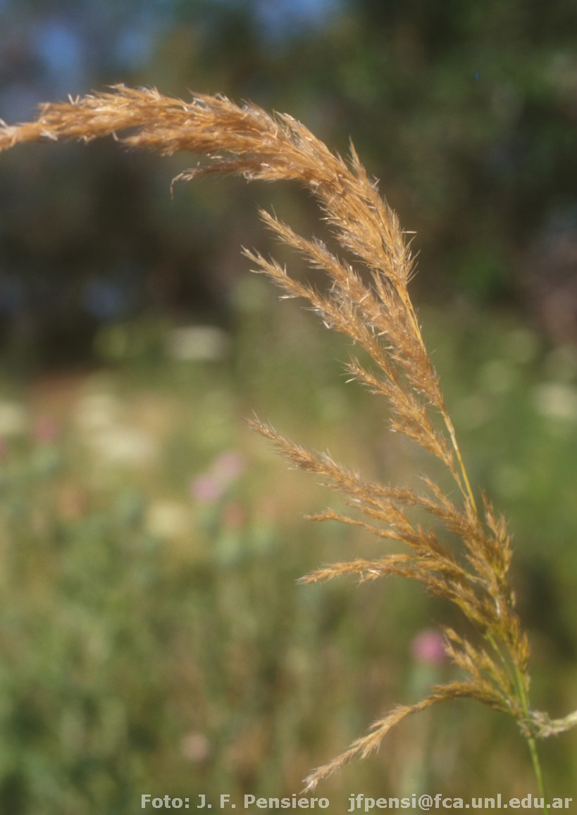 Plantas perennes, erectas, con rizomas cortos provistos de yemas con catafilos castaño-amarillentos a rojizos; cañas de 0,60-1,30 m de altura, nudos glabros, los inferiores mas aproximados; vainas glabras, pubescentes o escabrosas, mayores que los entrenudos; lígulas de 1-1,5 mm de largo, membranáceas, truncadas, borde brevemente laciniado; láminas planas de 8-30 cm x 3-10 mm, convolutas al secarse, glabras. Inflorescencia de 15-30 cm de largo, laxa, oblonga, contraída, decumbente, raquis glabro o escabriúsculo, ramificaciones inferiores hasta de 15 cm de largo, pedicelos escabrosos, menores que las espiguillas. Glumas de 5-6,5 mm de largo, linear-lanceoladas, acuminadas, 1-nervias, nervios escabrosos; lemma de 3,5-4 mm de largo, membranácea, escabrosa, 5-nervia, nervios visibles en toda su longitud, ápice truncado-denticulado, con una pequeña escotadura, arista de 1-5 mm de largo, geniculada, escabrosa, inserta en el tercio superior del dorso; pálea de 3-3,1 mm de largo, membranácea, 2-nervia, bicarinada, nervios escabrosos, ápice bífido; callo recurvado, piloso, los pelos sobrepasan al antecio; raquilla ca. ½ de la longitud del antecio, con pocos pelos en el ápice; lodículas 2, de 0,5-0,7 mm de largo, membranáceas; estambres 3, anteras de 0,5-0,7 mm de largo; ovario con dos estilos y estigmas plumosos; cariopsis fusiforme, comprimida lateralmente, generalmente de 2-3 mm de largo, hilo estrechamente elíptico, embrión de 0,4 mm de largo, endosperma blando, estigmas persistentes.