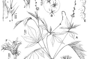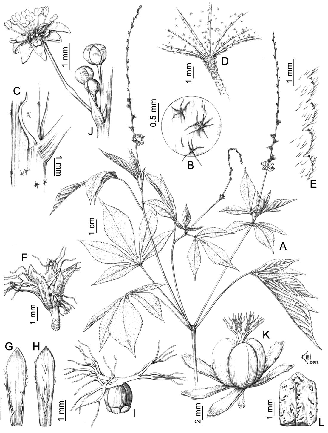 A. Rama florífera. B. Detalle del indumento de la porción más joven de los tallos. C. Detalle de las estípulas. D. Superficie abaxial de la base de la hoja. E. Detalle del margen de la hoja. F. Flor pistilada. G. Lóbulo del cáliz de una flor pistilada, cara interna. H. Lóbulo del cáliz de una flor pistilada, cara externa. I. Gineceo y nectarios florales (se extrajo el cáliz). J. Címulas estaminadas con una flor madura. K. Fruto inmaduro. L. Semilla, cara ventral. Tomado de Pl. Syst. Evol. 306.