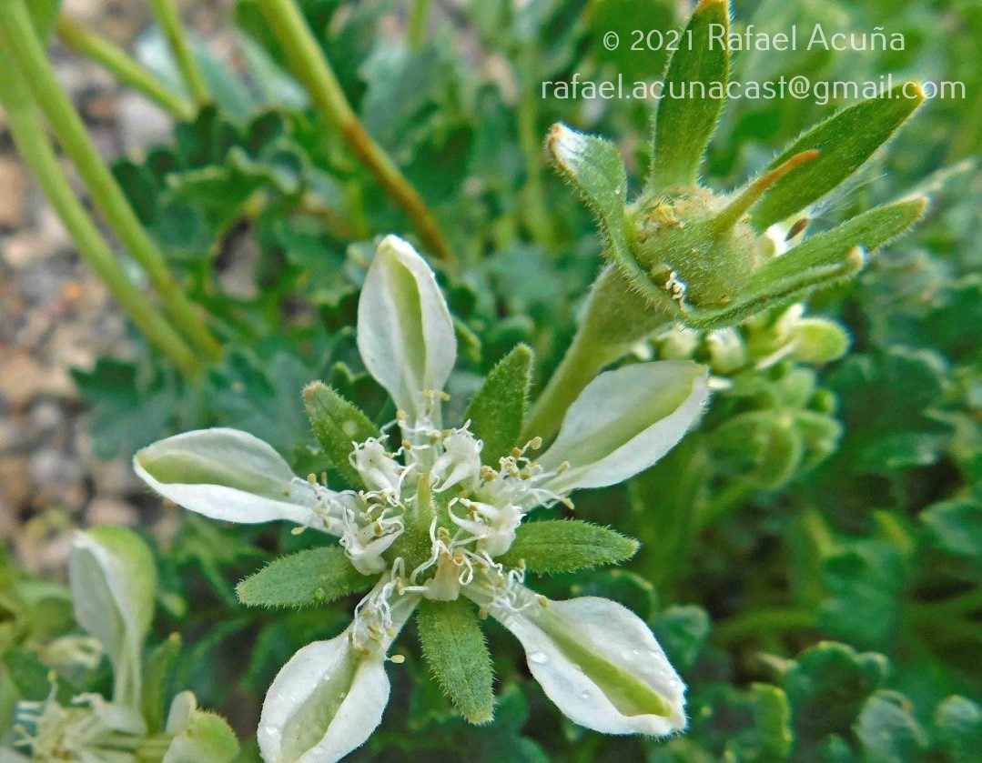Hierbas hasta de 17 cm de alto (incluyendo flores y frutos), rizomatosas, cubiertas por pubescencia de tricomas escabrosos y gloquidiados; tallos mayormente subterráneos, hasta ca. 2 mm de diámetro, con entrenudos cortos. Hojas opuestas, con el pecíolo hasta de 10 cm de largo; láminas usualmente 3-lobadas a 3-folioladas, raramente pinnaticompuestas (5-folioladas), los segmentos lobados, los laterales de 12-24 × 8-20 mm, peciólulos ausentes o hasta 6 mm de largo, segmento terminal de 10-30 × 12-37 mm. Inflorescencias de flores solitarias; flores erguidas, con los pedicelos elongándose hasta 14 cm de largo en la post-antesis, a veces con 1-3 brácteas rudimentarias recaulescentes. Flores con cáliz de lóbulos oblongos a estrechamente triangulares, hasta de 7 × 3 mm, márgenes enteros; pétalos cimbiformes, de 10-13 mm de largo, horizontales en la antesis, blancos a blanco verdosos, con la quilla verde y más oscura, uña estrecha y bien diferenciada, superficie adaxial pilosa a papilosa, superficie abaxial con abundantes tricomas; escamas nectaríferas 5, someramente cuculadas, ca. 4 × 2 mm, blanco verdosas, cortamente papilosas en la base, con el ápice lobulado, con tres filamentos dorsales, subiguales en longitud, hasta de 3 mm de largo, adheridos cerca del ápice de la escama, blancos, ligeramente expandidos y aplanados apicalmente; estaminodios dos por escama, en forma de S, hasta de 7 mm, con a base aplanada, los márgenes basales papilosos, los 2/3 distales adelgazado en un ápice papiloso filiforme; estambres numerosos, ca. 50-100 por flor, con los filamentos 6-9 mm de largo, anteras crema a amarillo claro; ovario inferior, con las superficies externas densamente pubescentes, estilo hasta de 5 mm de largo, con 5 lóbulos estigmáticos, glabro en la mitad distal; placentas 5. Frutos cápsulas obovoides a obcónicas, de 12-25 × 11-17 mm, rectas, ínferas, abriéndose por 5 valvas apicales. Semillas numerosas, ovoides a cónicas, cafés, con la testa profundamente punteada, paredes anticlinales altas; cono hilar pequeño e inconspicuo.