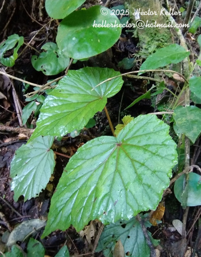 Hierbas terrestres o rupícolas de 0,7-1 m de alto, tallos con entrenudos de 5-14 cm de largo, erectos, glabros. Hojas pecioladas, basifijas, con pecíolo de 3-9,5 × 2 mm, craso, glabro excepto por un anillo de tricomas simples, 1-celulares. de 1-2 mm de largo en el ápice, debajo de la inserción con la lámina; láminas largamente ovadas, de 7-20 × 6-12 cm, asimétricas, oblicuas o transversales, base cordada o lobulada, ápice agudo o acuminado, margen entero o aserrado, actinodrómas, membranáceas, glabras o glabrescentes con algunos tricomas simples, esparcidos en el margen y en el ápice de la cara adaxial; estípulas triangulares, de 7-10 × 4-5 mm, margen entero, escariosas, glabras, persistentes o caducas. Inflorescencias en cimas dicasiales plurifloras, de 17-20 cm de largo; flores numerosas, las estaminadas con 4 tépalos, blancos, los dos externos ovados, de 4-5 × 3-4 mm, margen entero, glabros y los dos internos oblongo-elípticos, de 3,5-4 × 1,5-2,5 mm, margen entero, glabros; estambres con los filamentos de 0,5-1 mm de largo, libres, y anteras lineares, de 1,5-2 mm de largo; las pistiladas con 5 tépalos, blancos, los dos exteriores elípticos, de 6-7 × 2-3 mm, margen entero, glabros y los tres interiores obovado-elípticos, de 3,5-8 × 2-4 mm, margen entero, glabros, bractéolas linear-triangulares, de 0,5-1,5 mm de largo, ápice agudo, glabras; gineceo con ovario elíptico, de 5-6,5 × 2,5-3 mm, 3-locular, 3-alado, alas subiguales, la mayor de 2,7-3,5 mm de largo, ascendente, las dos menores de 1,2-2,1 mm de largo, glabro, estilos 3, cada uno dividido en dos ramas papilosas espiraladas, de 2,5-2,8 mm de largo. Fruto cápsula, ovado-oblonga, de 9-13 × 2-4 mm, base redondeada, ápice agudo, 3-alado, alas desiguales, la mayor, triangular, de ca. 16 × 8 mm, ascendente, las dos menores de ca. 15 × 5 mm, pedicelo fructífero de 5-7 mm de largo.