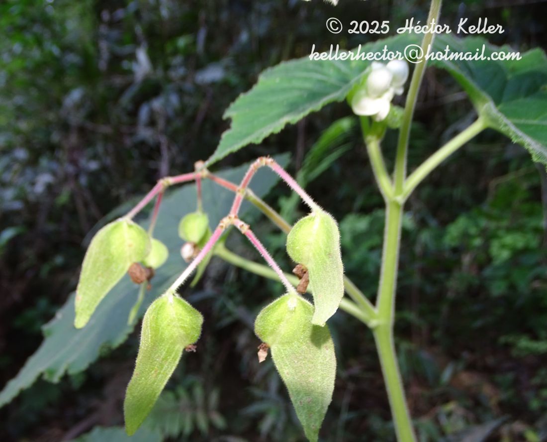Hierbas terrestres o rupícolas de 0,7-1 m de alto, tallos con entrenudos de 5-14 cm de largo, erectos, glabros. Hojas pecioladas, basifijas, con pecíolo de 3-9,5 × 2 mm, craso, glabro excepto por un anillo de tricomas simples, 1-celulares. de 1-2 mm de largo en el ápice, debajo de la inserción con la lámina; láminas largamente ovadas, de 7-20 × 6-12 cm, asimétricas, oblicuas o transversales, base cordada o lobulada, ápice agudo o acuminado, margen entero o aserrado, actinodrómas, membranáceas, glabras o glabrescentes con algunos tricomas simples, esparcidos en el margen y en el ápice de la cara adaxial; estípulas triangulares, de 7-10 × 4-5 mm, margen entero, escariosas, glabras, persistentes o caducas. Inflorescencias en cimas dicasiales plurifloras, de 17-20 cm de largo; flores numerosas, las estaminadas con 4 tépalos, blancos, los dos externos ovados, de 4-5 × 3-4 mm, margen entero, glabros y los dos internos oblongo-elípticos, de 3,5-4 × 1,5-2,5 mm, margen entero, glabros; estambres con los filamentos de 0,5-1 mm de largo, libres, y anteras lineares, de 1,5-2 mm de largo; las pistiladas con 5 tépalos, blancos, los dos exteriores elípticos, de 6-7 × 2-3 mm, margen entero, glabros y los tres interiores obovado-elípticos, de 3,5-8 × 2-4 mm, margen entero, glabros, bractéolas linear-triangulares, de 0,5-1,5 mm de largo, ápice agudo, glabras; gineceo con ovario elíptico, de 5-6,5 × 2,5-3 mm, 3-locular, 3-alado, alas subiguales, la mayor de 2,7-3,5 mm de largo, ascendente, las dos menores de 1,2-2,1 mm de largo, glabro, estilos 3, cada uno dividido en dos ramas papilosas espiraladas, de 2,5-2,8 mm de largo. Fruto cápsula, ovado-oblonga, de 9-13 × 2-4 mm, base redondeada, ápice agudo, 3-alado, alas desiguales, la mayor, triangular, de ca. 16 × 8 mm, ascendente, las dos menores de ca. 15 × 5 mm, pedicelo fructífero de 5-7 mm de largo.