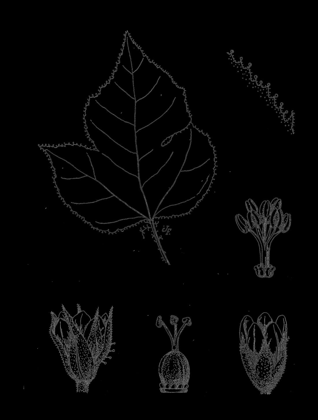 A. Hoja. B. Margen foliar. C. Flor pistilada. D. Pistilo. E. Flor estaminada. F. Androceo. Tomada de Lilloa 9: fig 18. 1943.