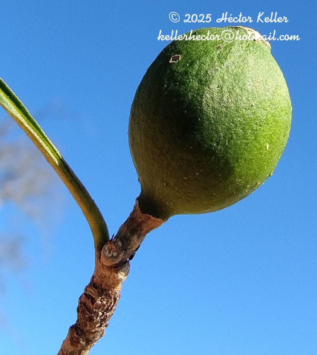 Árbol, arbolito o arbusto, de 0,8-4(-6) m de alto; ramas opuestas con 3-4 espinas por nudo, de 5,6-16,1 × 1,4-2,8 mm, glabras. Hojas con lámina elíptica, ovada u obovada, de 35,9-70 × 18,8-38,3 mm, a veces reducida y entonces orbicular o irregularmente circular, incluso en la misma rama, especialmente evidente en renovales, de ápice generalmente mucronado, glabra o pubérula; 4-7 venas secundarias de cada lado, visibles, ascendentes, pubérulas o pubescentes, domacios ausentes; pecíolo de 0,5-12,6 mm de largo, pubérulo; estipulas triangulares u ovadas, de 3,5-6,4 × 2,4-5,2 mm, el ápice agudo o acuminado, generalmente mucronadas, ciliadas, externamente glabras e internamente con coléteres y tricomas simples en la base. Inflorescencia estaminada terminal, fasciculada, 3-8-flora. Flores estaminadas 4-6(-7)-meras, de 10,8-21,4 mm de largo, fragantes; pedicelo de 1,6-6,7 mm de largo; cáliz con (4-)5(-6-7) lóbulos ovados, de 3,1-5,9 × 1,4-2,6 mm, iguales o subiguales, ciliados a glabros; corola hipocrateriforme, con lóbulos obovados, de 6,6-11,1 × 5,9-9 mm, blancos, de ápice redondeado, margen ligeramente ondulado; tubo de 11,5-14,7 × 2,1-2,8 mm, externamente glabro e internamente pubérulo desde la mitad del tubo hasta la base de los lóbulos, verdoso; pistilodio parcialmente exerto; estigma liso, 2-fido, lóbulos ovoides; disco nectarífero epígino; estambres parcialmente exertos, anteras sésiles, de 4,5-5,2 mm de largo; ovario obcónico, glabro o pubérulo. Inflorescencias pistiladas 1-floras. Flores pistiladas con pedicelo de 0,9-2,7 mm de largo; cáliz con 5 lóbulos ovados, de 2,9-4,4 × 1,7-2,9 mm, iguales, glabros en ambas caras, ciliados; corola hipocrateriforme con lóbulos obovados, de 6,6-9,3 × 5,5-8,1 mm, blancos, de ápice redondeado, margen ligeramente ondulado; tubo de 10,6-14,4 × 2,1-3,1 mm, externamente glabro o pubérulo e internamente pubérulo desde la mitad del tubo hasta la base de los lóbulos, verdoso; anteras de 1,8-2,8 mm de largo, parcialmente exertas, sésiles; ovario urceolado, de 8,2-10,3 × 3,5-4,3 mm, glabro o pubérulo; estilo parcialmente exerto, glabro; estigma 2-fido, lóbulos estigmáticos ovados, papilosos; disco nectarífero epígino. Fruto una baya generalmente obovoidea o globosa, de 22-27,4 × 14,8-17,2 mm, glabra; pedicelo de 4-7 mm de largo; pericarpo de 0,8-1 mm de espesor, coriáceo. Semillas de contorno obovado, discoides, de 7,1-8,8 mm de largo, nigrescentes, inmersas en una pulpa gelatinosa.