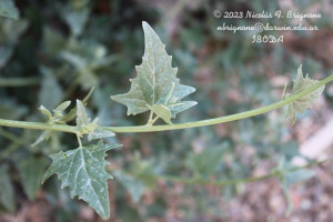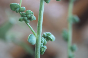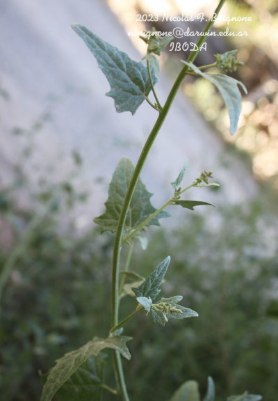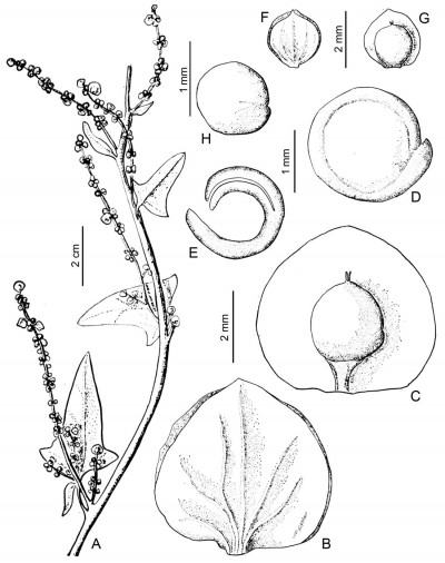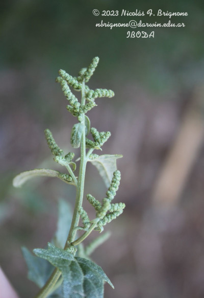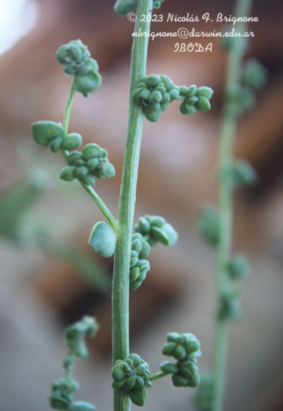 Plantas herbáceas, anuales, monoicas, de 50-150 cm de alto, ramificadas desde la base. Hojas alternas, pecioladas, dimorfas: las basales ovado-hastadas, de 5 × 2,5 cm, con margen entero o dentado, base 2-lobulada y ápice obtuso; las superiores más angostas, de 3,5 × 1 cm, sin lóbulos; anatomía no Kranz. Inflorescencias en tirsos, agrupados en espigas no foliosas. Bractéolas fructíferas anchamente ovadas o circulares, soldadas entre sí en la región basal, con margen entero, dimorfas; algunas más grandes, de 4-6 mm de diámetro, con semillas negruzcas; otras más pequeñas, de 2-2,5 mm de diámetro, con semillas castañas; cara externa lisa. Semillas con embrión con radícula basal.