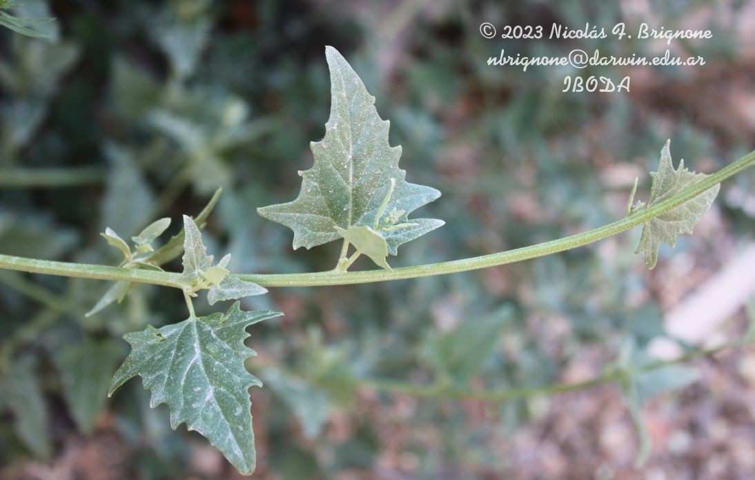 Plantas herbáceas, anuales, monoicas, de 50-150 cm de alto, ramificadas desde la base. Hojas alternas, pecioladas, dimorfas: las basales ovado-hastadas, de 5 × 2,5 cm, con margen entero o dentado, base 2-lobulada y ápice obtuso; las superiores más angostas, de 3,5 × 1 cm, sin lóbulos; anatomía no Kranz. Inflorescencias en tirsos, agrupados en espigas no foliosas. Bractéolas fructíferas anchamente ovadas o circulares, soldadas entre sí en la región basal, con margen entero, dimorfas; algunas más grandes, de 4-6 mm de diámetro, con semillas negruzcas; otras más pequeñas, de 2-2,5 mm de diámetro, con semillas castañas; cara externa lisa. Semillas con embrión con radícula basal.