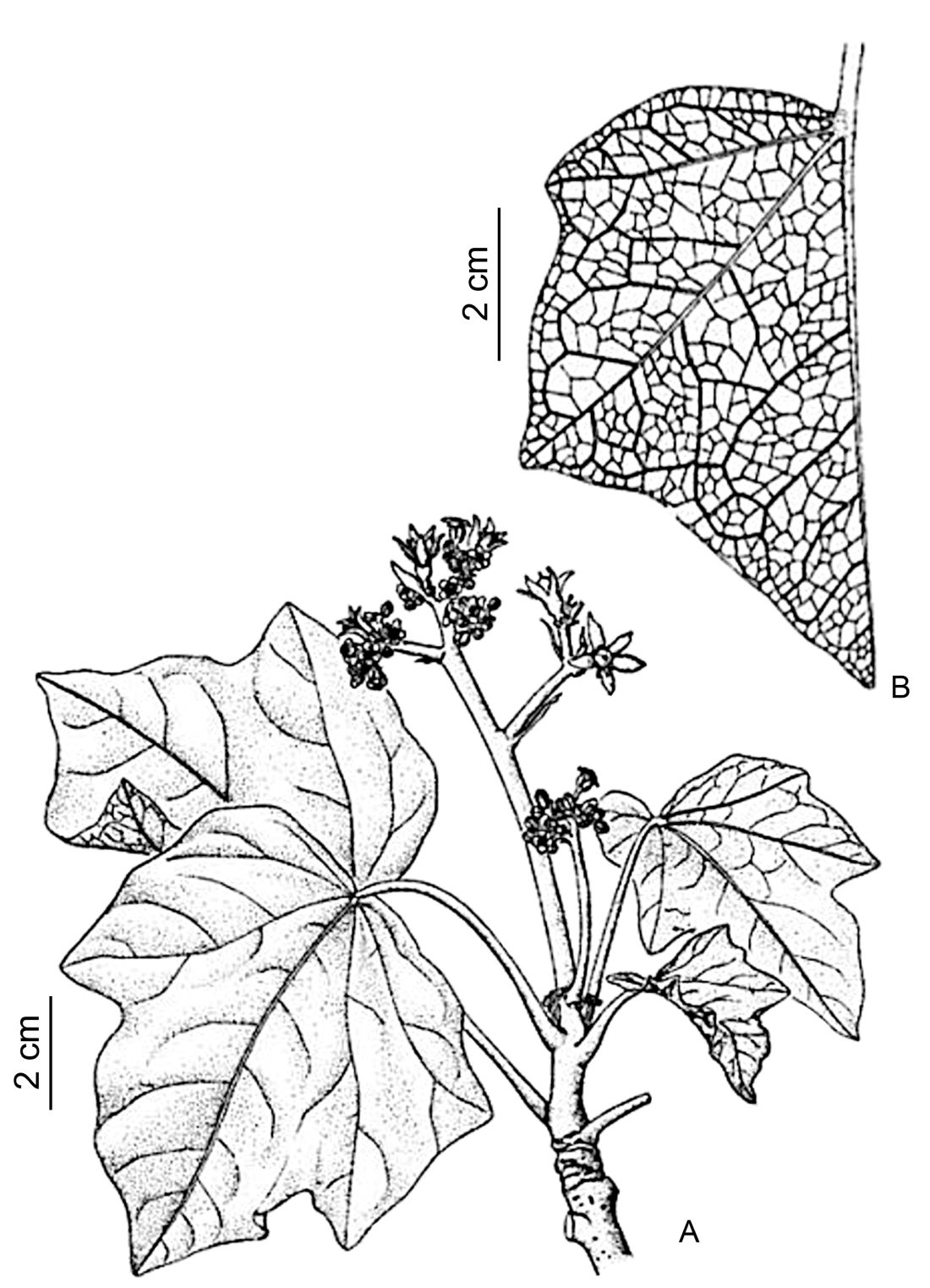 A. Rama florífera. B. Detalle de nerviación de la hoja.