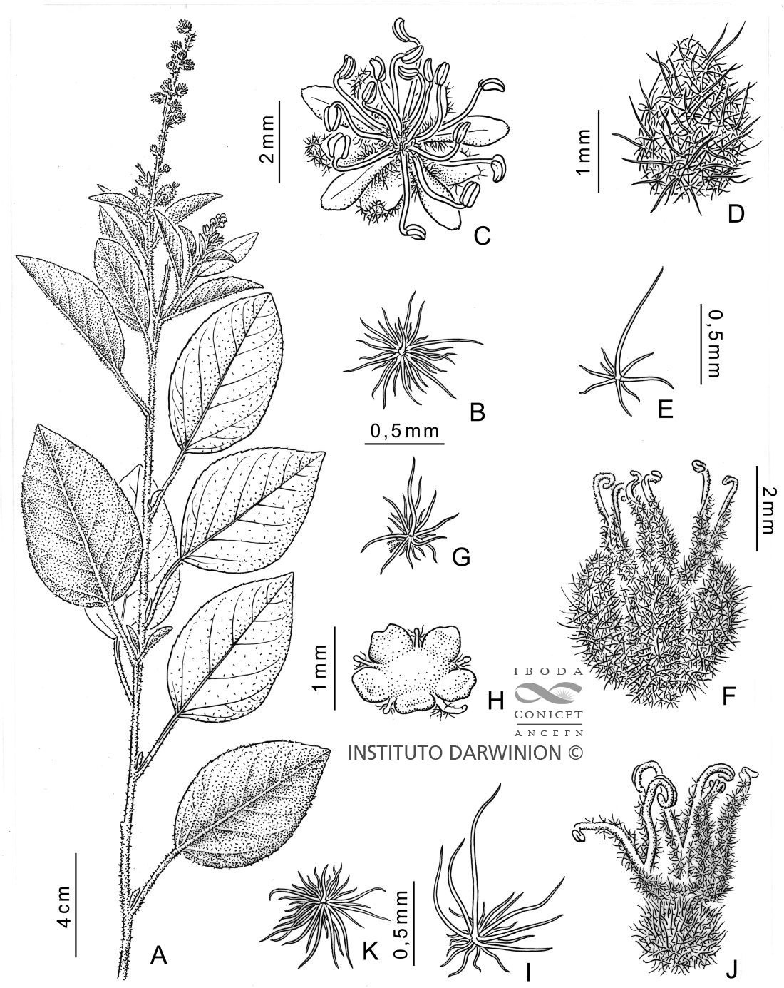 Arbustos monoicos de 0.5-2 m de alto, con xilopodios y generalmente con múltiples tallos cilíndricos, erectos o algo decumbentes, látex transparente o amarillento; indumento tomentoso o hirsuto, amarillento, blanco, o amarillento-ferrugíneo, con tricomas estrellado-porrectos. Hojas alternas, subopuestas o subverticiladas debajo de las bifurcaciones o inflorescencias; pecíolos de 0,2-3,5 cm de largo, sin glándulas acropeciolares; estípulas angostamente lanceoladas a triangulares, de 1-5,5 × 0,4-0,8 mm, con 10-15 coléteres (tricomas secretores de néctar o mucílago) ovoides o subglobosos; láminas ovadas, elípticas u obovadas, de 2,5-12 × 1,5-9 cm, membranáceas a subcoriáceas, conduplicadas antes de desplegarse, discoloras, venación con 7-14 pares de venas secundarias impresas en la cara adaxial y prominentes en la cara abaxial, ápice acuminado, agudo, obtuso o redondeado, base obtusa, algo truncada, redonda o ligeramente cordada, con 2-7 coléteres sésiles globosos o estipitados en la cara adaxial, sin nectarios extraflorales en la base; margen entero o aserrulado con coléteres globosos o elipsoides, verde en la cara adaxial, con indumento corto-tomentoso o glabrescente, blancuzca en la cara abaxial con indumento tomentoso o hirsuto, sobre todo sobre las venas. Inflorescencias racemiformes, 2-sexuales, de 2-19 cm de largo, terminales o en las dicotomías de las ramas, con pocas hasta 30 flores pistiladas en la parte basal, luego címulas estaminadas en la parte distal con (1-)2-5 flores cada una; brácteas de ambos sexos lineares, lanceoladas, o triangulares, con coléteres globosos en la base. Flores estaminadas con pedicelo de 1-2(-2,5) mm de largo; cáliz 5-partido, valvado, sépalos ovados de 2-3 × 1,3–2 mm, externamente pubescentes, tricomas estrellado-rotados porrectos; pétalos elípticos a obovados, de 2,4-3,4 × 0,7-1,4 mm, glabros en la parte superior, margen del tercio inferior viloso; estambres (12-)15-16(-20), filamentos de 4-5,3 mm de largo, vilosos en la base, anteras de 0,7-1 × 0,5-0,6 mm, de contorno oblongo o elipsoides, disco 5-segmentado. Flores pistiladas con pedicelo de 0,3-1 mm de largo; sépalos 5, ovados a elípticos, de 2,4-4,3 × 0,7-2,3 mm, iguales, externamente tomentosos, con tricomas estrellado-porrectos; pétalos lineares o lanceolados, de 0,3-1,8(-3,2) × 0,1-0,6 mm, glabrescentes; disco 5-lobulado; ovario subgloboso, de 1,7-2,3 × 2-2,5 mm, hirsuto o hirsuto-tomentoso con tricomas estrellado-porrectos; estilos 2-fidos, de 4-6,5 mm de largo, unidos por 1/4-3/5 del largo, terminaciones estigmáticas 6. Fruto cápsulas de contorno oblongo, levemente 3-gonas, de 5-6,5 × 4,5-6 mm; pedicelo de 0,5-2(-4) mm de largo, tomentosas a hirsutas; columela con 3 lóbulos prominentes ascendentes, lisos. Semillas de contorno oblongo, de 3,9-4,9 × 1,9-2,6 mm, grisáceas, la superficie lisa a finamente folveolada; carúncula subapical y sésil de 1,5-1,8 mm de largo, en forma de capuchón.