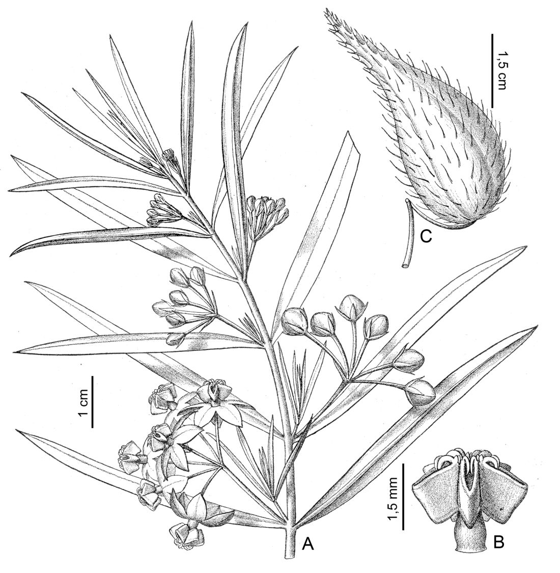 Arbustos de 0,5-3 m de alto, ramificados desde la base, rámulos pubescentes, raro tomentosos. Hojas opuestas; pecíolo de 1-10 mm de largo; lámina linear a linear-lanceolada, de 2,5-12 × 0,2-1,3 cm, de ápice agudo a atenuado, mucronado, base estrecha a anchamente cuneada, subglabra a esparcidamente pubescente, con tricomas suaves en la vena media y el margen. Inflorescencias con 4-12 flores; pedúnculo de 1,5-4 cm de largo, pubescente; brácteas filiformes, deciduas; pedicelo de 1-2,5 cm de largo, pubescente; cáliz con lóbulos lanceolados o triangular-atenuados, de 2-5 × 0,6-1,3 mm, pubescentes; corola blanca, reflexa, lóbulos ovados, de 5-8 × 3-5 mm, subagudos, cara adaxial minutamente papilosa y con el margen derecho densamente cubierto de largos tricomas blancos; corona con lóbulos blancos o liláceos, unidos a la columna estaminal a 1-1,5 mm sobre la base de ésta, lateralmente comprimidos, de 2-4 × 1,5-3 mm, tan altos como la columna, margen superior entero; cabeza estilar plana; anteras con alas de 1,5-2 mm de largo.; polinario con retináculo subcilíndrico, de 0,3 × 0,10-0,15 mm; caudículas ca. 0,3 mm de largo; polinios oblongos u oblanceolados, de 1,2-1,3 × 0,3 mm, aplanados. Folículos ovoides, de 4-7 × 1,5-2,5 cm, inflados, pubescentes, ápice agudo, cubiertos con apéndices filiformes ca. 1 cm de largo, con pedúnculos contortos, erectos. Semillas obovadas, comosas, de 3,5-5 × 2 mm, la superficie verrucosa.