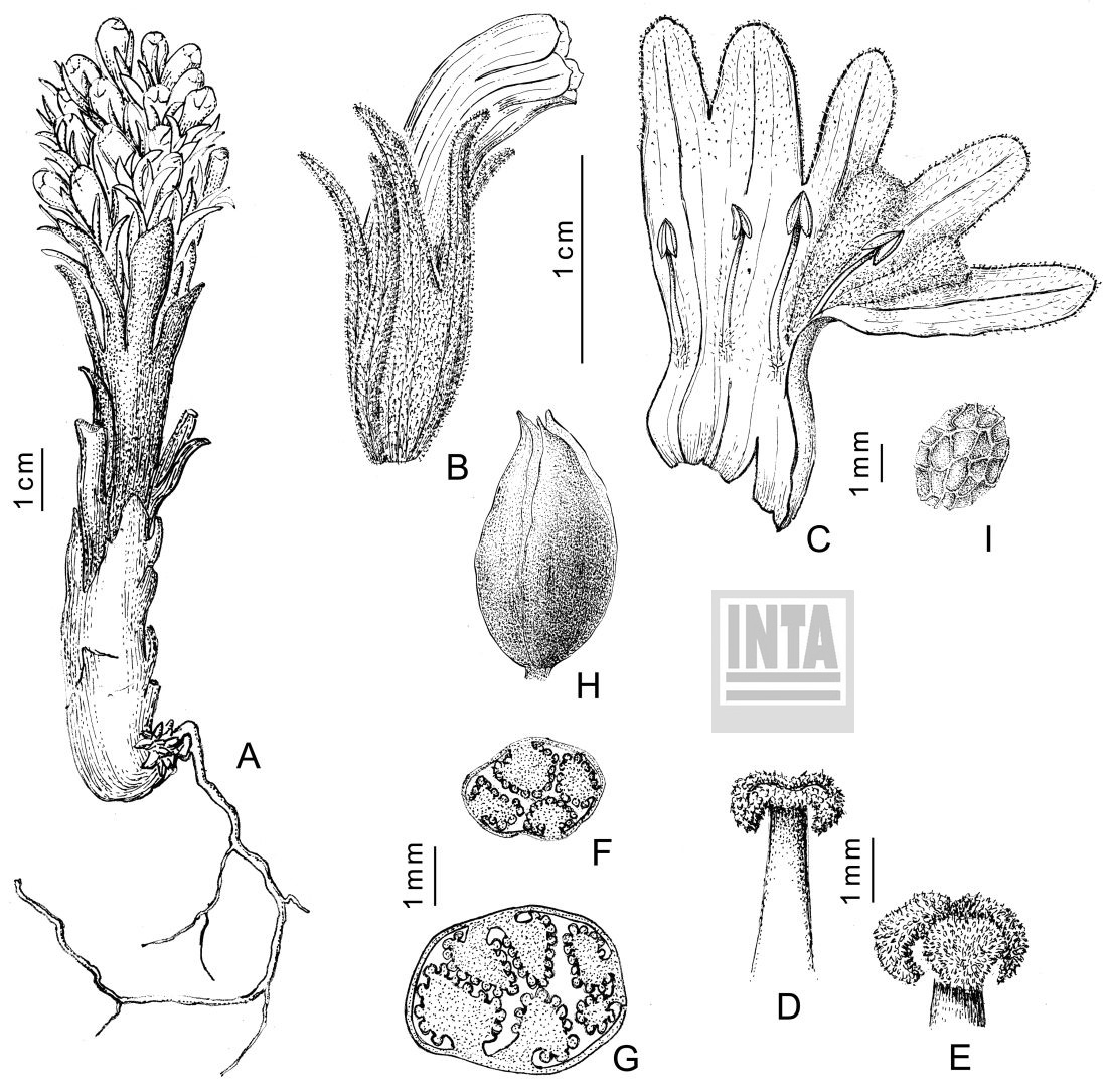 Hierbas de 6-15 cm de alto, carnosas, blanquecinas a herrumbroso pálidas en vivo, más oscuras y quebradizas cuando seca; porción subterránea hasta de 5 cm de largo, glabra, blanquecina, con unas pocas catáfilas y con primordios haustoriales cortos y carnosos.. Tallos con hojas reducidas a escamas hasta de 15 × 7 mm, subadpresas, disminuyendo en tamaño hacia el ápice. Inflorescencia en racimo denso, espiciforme. Flores con corola rosado-lilácea con la fauce amarilla, en la axila de una bráctea, con 2 bractéolas; cáliz de 10- 20 mm de largo, campanulado, levemente zigomorfo, densamente glanduloso; tubo de la corola de 15-25 mm de largo; estambres laterales con filamento de 6,5-7,5 mm de largo, ventrales de 7-8,5 mm de largo, anteras dorsifijas, tecas glabras o pubescentes; ovario ovoide a elipsoide, de 4-6,5 × 2,4-4 mm, estilo de igual longitud que el ovario, grueso, recto o algo curvado, estigma con 2-3 lóbulos papilosos, recurvados. Cápsula ovoide a elipsoide, de 9-12 × 5-7,5 mm, generalmente bivalva, raro 4-valva. Semillas ca. 0,5 mm de largo, reticuladas.