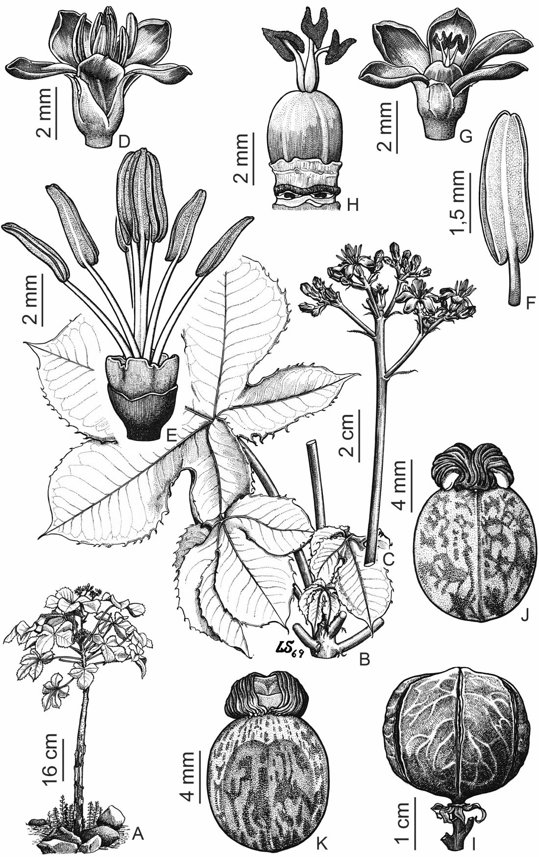 A. Planta. B. Porción de rama florífera. C. Inflorescencia. D. Flor estaminada. E. Androceo y disco. F. Estambre. G. Flor pistilada. H. Gineceo. I. Fruto. J-K. Semilla, vistas ventral y dorsal respectivamente.