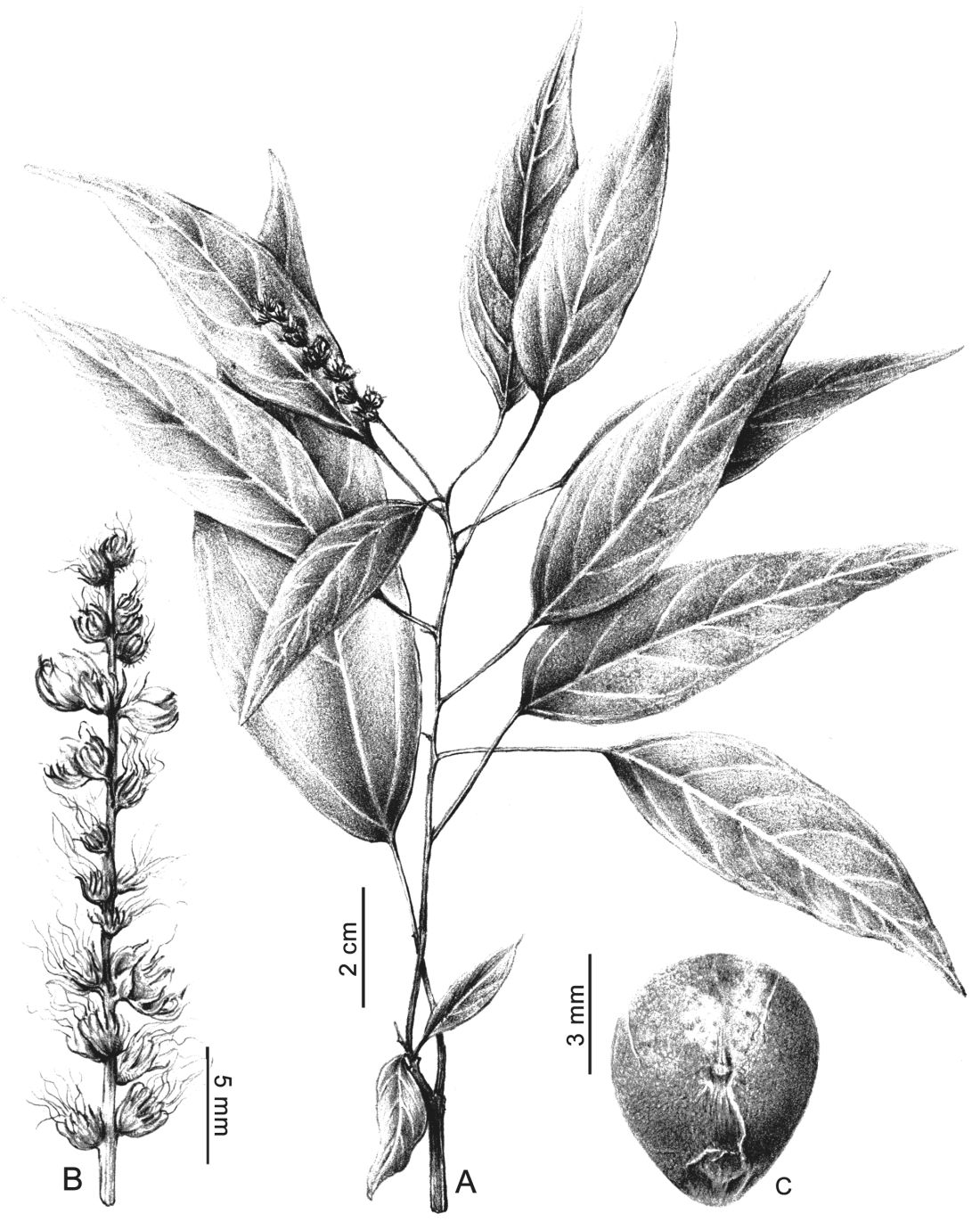 A. Rama florífera. B. Inflorescencia pistilada. C. Semilla.