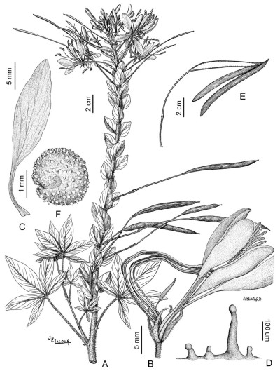Hierbas o arbustos de 0,7 a 1,8 m de alto; ramas pubescentes a glandulares-pilosas en todas partes. Hojas con pecíolos de 3,5-9 cm de largo, pubescentes, generalmente armados con espinas rectas, delgadas o gruesas; espinas estipulares, de 3-4 × 2 mm, rectas; pecíolulos de 1-3 mm de largo, inermes, densamente pubescentes; láminas 5-7 folioladas, folíolos elípticos a oblanceolados, de 3,8-8,5(-12) × 1,5-2,5(-4) cm, basalmente cuneados a atenuados, apicalmente agudos a acuminados, margen minuciosamente serrulado-ciliado, ambas caras pubescentes, nervadura central y venas secundarias pubescentes, con espinas. Inflorescencia en racimos corimbiformes, de 27-40 cm de largo, terminales; brácteas con pecíolos de 2-4 mm de largo, pubescentes y lámina ovada o cordiforme, de 10-22 × 5-8 mm, basalmente obtusa a cordiforme, apicalmente aguda, margen ciliado, glabrescente. Flores con pedicelos de 20-50 mm de largo, pubescentes; sépalos lineares-triangulares a estrechamente lanceolados, de 5-7 × 1 mm, acuminados a largamente acuminados, margen ciliado, pubescentes abaxialmente; pétalos oblongos a oblanceolados, de 18-20 × 7-8 mm, basalmente contraídos en una garra de 8-13 mm de largo, apicalmente obtusos, rosa a morado, rara vez blancos, glabros; nectario cónico, carnoso discreto, obsoleto en el fruto; filamentos estaminales de 50-70 mm de largo, color vinoso, anteras de 8-11 mm de largo; ovario cilíndrico, de 4-8 mm de largo, glabro; estilo ausente, estigma discoide, sésil. Fruto cilíndrico, de 5-10 × 0,2-0,5 cm, glabros; ginóforo de 4-8 cm de largo. Semillas suborbiculares, de 2-2,5 × 1,5-2 mm, longitudinalmente estriadas, transversalmente estriadas, hendiduras cubiertas por una membrana brillante.