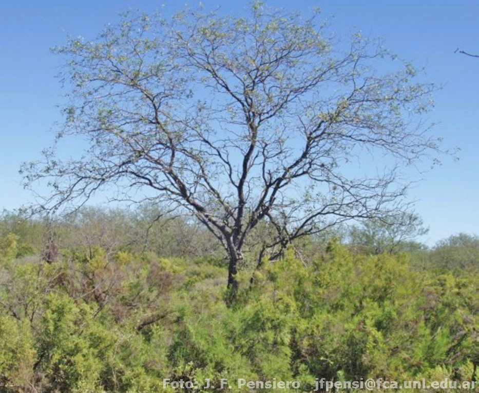 Árbol de hasta 12 m de alt., tronco ramificado a poca altura, ramas flexuosas. Espinas en general solitarias, rectas, cilindro-cónicas, de (1) 3-15 (33) cm. Hojas uniyugadas, glabras, pinnas 2-5-yugadas, folíolos coriáceos, de 2-10 x 0,7-3,8 cm. Inflorescencias de 8-15 cm. Legumbres submoniliformes, rectas, subfalcadas o en forma de S, 13-19 x 0,9-1,1 cm, márgenes ondulados, pajizas con manchas violáceas. Semillas aovadas, con bordes redondeados o angulosos y ondulados, asimétricas.