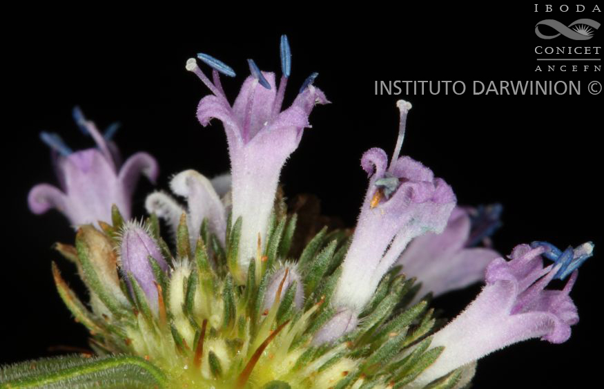 Sufrútice erecto, de 15-70 cm de alto; tallos simples, a veces ramificados desde la base o con escasas ramas laterales, subcilíndricos o 4-gonos, glabrescentes, pubérulos o pubescentes. Hojas sésiles, opuestas, raro con braquiblastos muy poco desarrollados en las axilas, angostamente elípticas, elípticas u ovadas, de 30-70 × 2-18 mm, cartáceas o coriáceas, pubérulas o pubescente en el haz, glabrescentes o con escasos pelos sobre los nervios del envés, con 3-4 pares de nervios secundarios subopuestos, ápice agudo y base atenuada. Vaina estipular obtriangular, de 4-8 mm de largo, glabrescente o pubescente; lacinias 6-7, glabras. Inflorescencias con 1 glomérulo apical, a veces con 1 glomérulo subapical, de 10-23 mm de diámetro; brácteas (2-)4-6, foliáceas, más largas que el diámetro de los glomérulos. Flores 4-meras, sésiles; hipanto turbinado, de 2-3 mm de largo, pubescente en la mitad superior; cáliz 4-partido, lóbulos angostamente triangulares, de 1,7-3 mm de largo, glabrescentes o pilosos; corola infundibuliforme, de 4,5-7 mm de largo, blanca o lila, externamente pubescente con papilas más largas en el ápice de los lóbulos, internamente con un anillo de pelos moniliformes sobre el tubo; estambres con anteras 1,25-1,5 mm de largo, blancas, liláceas o azules; estilo de 5-7 mm de largo, estigma 2-lobado. Fruto una cápsula subelipsoide, de 2,5-4 mm de largo, densamente pubescente en el tercio superior, valvas dehiscentes. Semillas de contorno angostamente elíptico u ovado, de 1,6-2,5 × 0,4-0,8 mm; exotesta retículo-areolada.