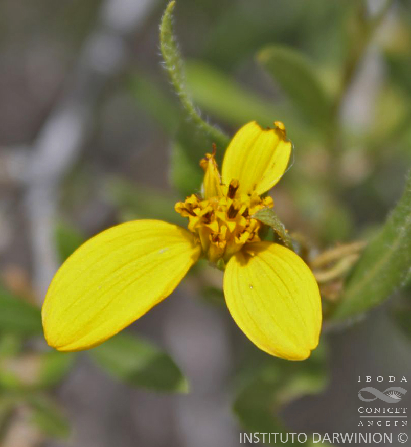 Arbustos hasta de 1 m de alto; tallos decumbentes o ascendentes, hojosos, puberulentos. Hojas brevemente pecioladas (pecíolos de 1,5-6 mm de largo); láminas lanceoladas a oblanceoladas, de 3-6(-8) × 0,5-1,5(-2) cm, atenuadas hacia base, agudas en el ápice, margen entero, algo híspidas, sobre todo en los bordes, o glabrescentes en ambas caras. Capítulos solitarios o dispuestos en cimas de 2-4, sobre pedúnculos pilosos de 1-5 cm de largo. Involucro acampanado, ca. 5 × 6 mm; filarios 2-3-seriados, subiguales, de 4-6(-8) × 1-2 mm, híspidos a glabrescentes, los externos linear- a ovado-lanceolados, los internos rómbico-ovados. Receptáculo con páleas oblanceoladas, de 6-8 mm de largo, glabras a hirsutas, margen hialino. Flores del margen 7-10, con corola amarilla, ligulada, tubo seríceo de 3-4 mm de largo y lígula oblongoovalada, de 7-16 × 5-8 mm; flores del centro 10-15(-25), perfectas, con corola tubulosa, de 3-4 mm de largo, glabra. Aquenios obcónicos, de 4-6 mm de largo, algo comprimidos, seríceos. Papus formado por 2 aristas, de 2-2,5 mm de largo, persistentes.