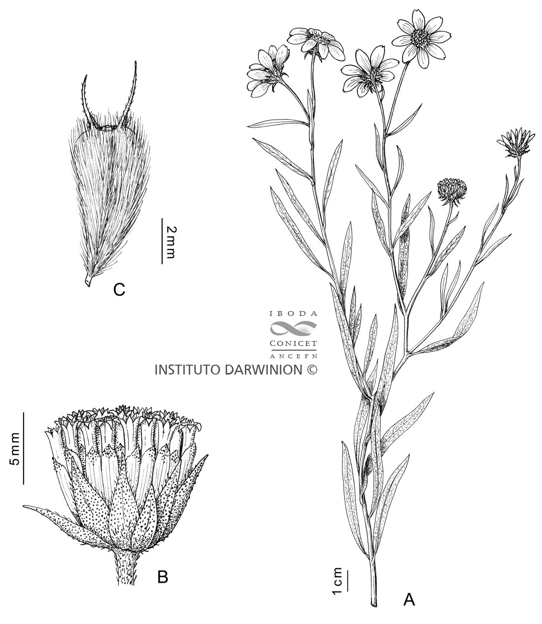 Arbustos hasta de 1 m de alto; tallos decumbentes o ascendentes, hojosos, puberulentos. Hojas brevemente pecioladas (pecíolos de 1,5-6 mm de largo); láminas lanceoladas a oblanceoladas, de 3-6(-8) × 0,5-1,5(-2) cm, atenuadas hacia base, agudas en el ápice, margen entero, algo híspidas, sobre todo en los bordes, o glabrescentes en ambas caras. Capítulos solitarios o dispuestos en cimas de 2-4, sobre pedúnculos pilosos de 1-5 cm de largo. Involucro acampanado, ca. 5 × 6 mm; filarios 2-3-seriados, subiguales, de 4-6(-8) × 1-2 mm, híspidos a glabrescentes, los externos linear- a ovado-lanceolados, los internos rómbico-ovados. Receptáculo con páleas oblanceoladas, de 6-8 mm de largo, glabras a hirsutas, margen hialino. Flores del margen 7-10, con corola amarilla, ligulada, tubo seríceo de 3-4 mm de largo y lígula oblongoovalada, de 7-16 × 5-8 mm; flores del centro 10-15(-25), perfectas, con corola tubulosa, de 3-4 mm de largo, glabra. Aquenios obcónicos, de 4-6 mm de largo, algo comprimidos, seríceos. Papus formado por 2 aristas, de 2-2,5 mm de largo, persistentes.