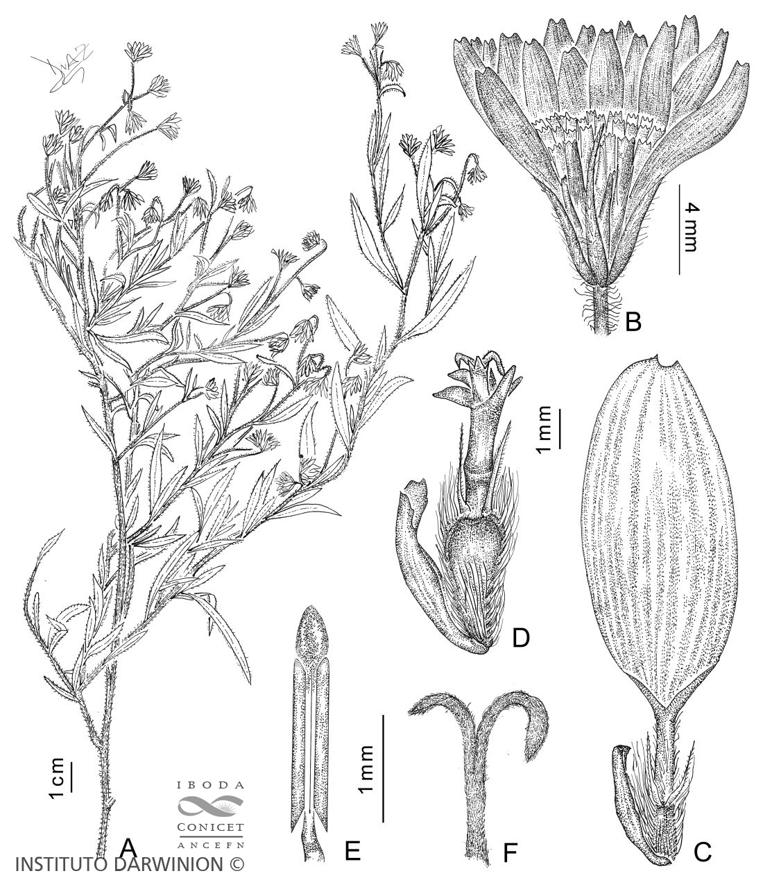 Arbustos hasta de 1 m de alto; tallos decumbentes o ascendentes, hojosos, puberulentos. Hojas brevemente pecioladas (pecíolos de 1,5-6 mm de largo); láminas lanceoladas a oblanceoladas, de 3-6(-8) × 0,5-1,5(-2) cm, atenuadas hacia base, agudas en el ápice, margen entero, algo híspidas, sobre todo en los bordes, o glabrescentes en ambas caras. Capítulos solitarios o dispuestos en cimas de 2-4, sobre pedúnculos pilosos de 1-5 cm de largo. Involucro acampanado, ca. 5 × 6 mm; filarios 2-3-seriados, subiguales, de 4-6(-8) × 1-2 mm, híspidos a glabrescentes, los externos linear- a ovado-lanceolados, los internos rómbico-ovados. Receptáculo con páleas oblanceoladas, de 6-8 mm de largo, glabras a hirsutas, margen hialino. Flores del margen 7-10, con corola amarilla, ligulada, tubo seríceo de 3-4 mm de largo y lígula oblongoovalada, de 7-16 × 5-8 mm; flores del centro 10-15(-25), perfectas, con corola tubulosa, de 3-4 mm de largo, glabra. Aquenios obcónicos, de 4-6 mm de largo, algo comprimidos, seríceos. Papus formado por 2 aristas, de 2-2,5 mm de largo, persistentes.