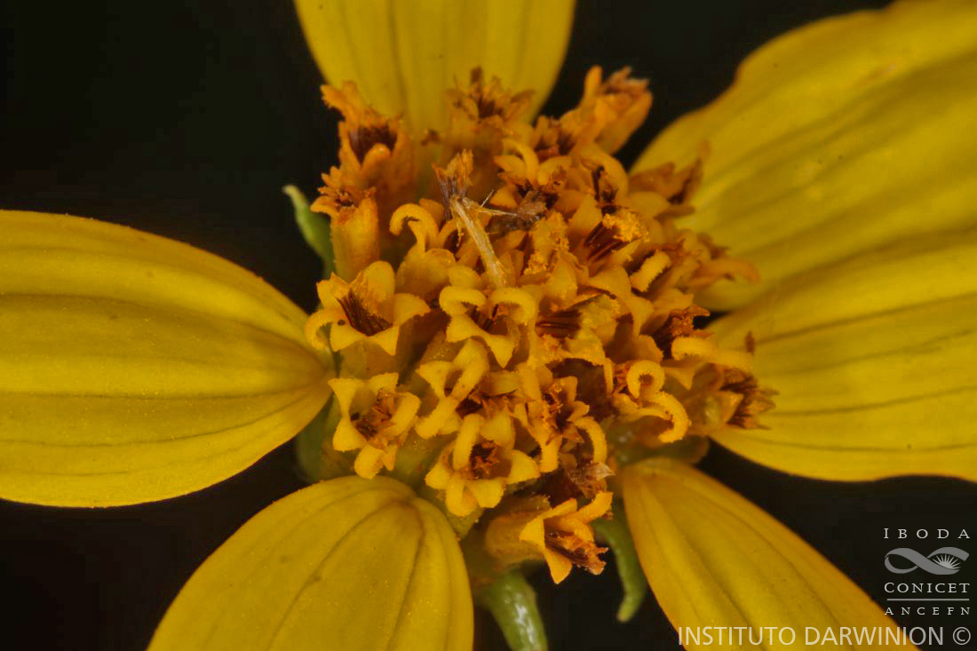 Arbustos hasta de 1 m de alto; tallos decumbentes o ascendentes, hojosos, puberulentos. Hojas brevemente pecioladas (pecíolos de 1,5-6 mm de largo); láminas lanceoladas a oblanceoladas, de 3-6(-8) × 0,5-1,5(-2) cm, atenuadas hacia base, agudas en el ápice, margen entero, algo híspidas, sobre todo en los bordes, o glabrescentes en ambas caras. Capítulos solitarios o dispuestos en cimas de 2-4, sobre pedúnculos pilosos de 1-5 cm de largo. Involucro acampanado, ca. 5 × 6 mm; filarios 2-3-seriados, subiguales, de 4-6(-8) × 1-2 mm, híspidos a glabrescentes, los externos linear- a ovado-lanceolados, los internos rómbico-ovados. Receptáculo con páleas oblanceoladas, de 6-8 mm de largo, glabras a hirsutas, margen hialino. Flores del margen 7-10, con corola amarilla, ligulada, tubo seríceo de 3-4 mm de largo y lígula oblongoovalada, de 7-16 × 5-8 mm; flores del centro 10-15(-25), perfectas, con corola tubulosa, de 3-4 mm de largo, glabra. Aquenios obcónicos, de 4-6 mm de largo, algo comprimidos, seríceos. Papus formado por 2 aristas, de 2-2,5 mm de largo, persistentes.
