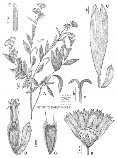 Arbustos hasta de 1 m de alto; tallos ascendentes, hirsútulos. Hojas con pecíolos de 5-10 mm de largo y láminas ovadas a lanceoladas, de 3-5(-7) × 1-2,5 cm, base cuneada o truncada y ápice agudo, margen entero, estrigulosas en ambas caras. Capítulos dispuestos en cimas de a 2-4, sobre pedúnculos de 2- 4 cm de largo. Involucro hemisférico, de 7-9 × 8,5-11 mm; filarios 2-seriados, herbáceos, de 5-7 × ca. 1,5 mm, los externos linearlanceolados a linear-espatulados, los internos ovadolanceolados. Receptáculo con páleas oblanceoladas, ca. 7 mm de largo. Flores del margen ca. 8, con corola amarilla, ligulada, con tubo hirsútulo ca. 5 mm de largo y lígula elíptica, ca. 18 × 8 mm; flores del centro ca. 30, con corola tubulosa, ca. 5 mm de largo. Aquenios obcónicos, ca. 5 mm de largo, seríceos en los márgenes. Papus compuesto por 2 aristas, de 3-4 mm de largo, persistentes.