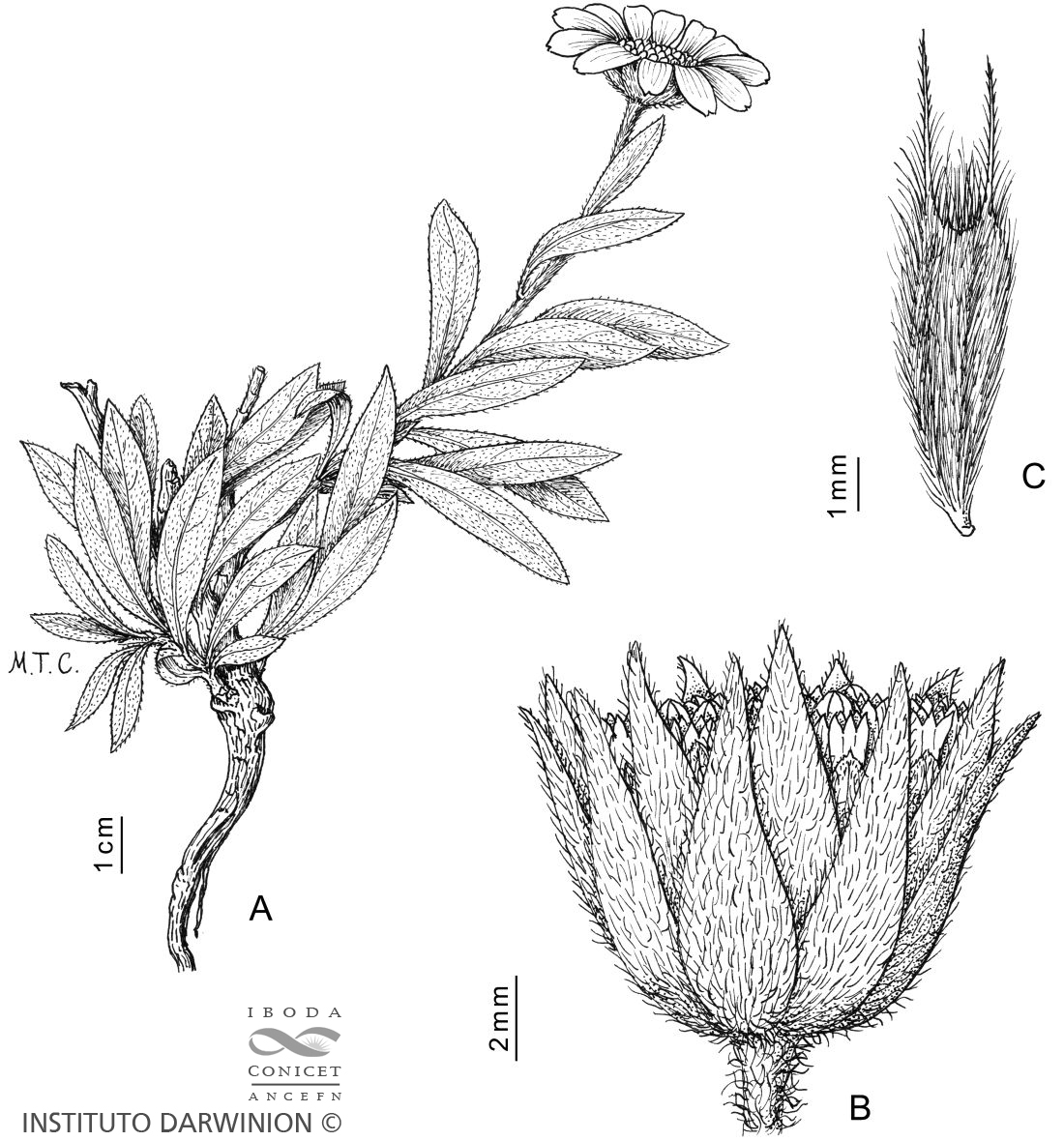 Subarbustos hasta de 40 cm de alto, con tallos algo ascendentes, densamente pubescentes, hojosos en la parte inferior y casi desnudos en la superior. Hojas con pecíolos muy breves, hasta de 5 mm de largo y láminas angostamente lanceoladas a oblongas, de 2-8,5 × 0,8-1,8 cm, de base atenuada, ápice usualmente agudo y margen entero, venación reticulada notable. Capítulos solitarios, sobre pedúnculos de 2-10 cm de largo, densamente pubescentes. Involucro acampanado, de 10- 12 × ca. 12 mm; filarios 2-seriados, herbáceos, ca. 11 × 2-2,5 mm, los externos lanceolados, de ápice atenuado, pubescentes en el dorso, los internos rómbico-ovados, acuminados, esparcidamente pilosos. Receptáculo con páleas oblanceoladas, de 8-10 mm de largo. Flores del margen 9-15, con lígula linear-oblonga, de 17-32 × 4-10 mm, con tubo seríceo, ca. 5 mm de largo; flores del centro ca. 50, corola ca. 5 mm de largo, con tubo ca. 1 mm de largo. Aquenios obcónicos, ca. 6 mm de largo, densamente seríceas. Papus formado por 2 aristas de 3-4 mm de largo, persistentes.