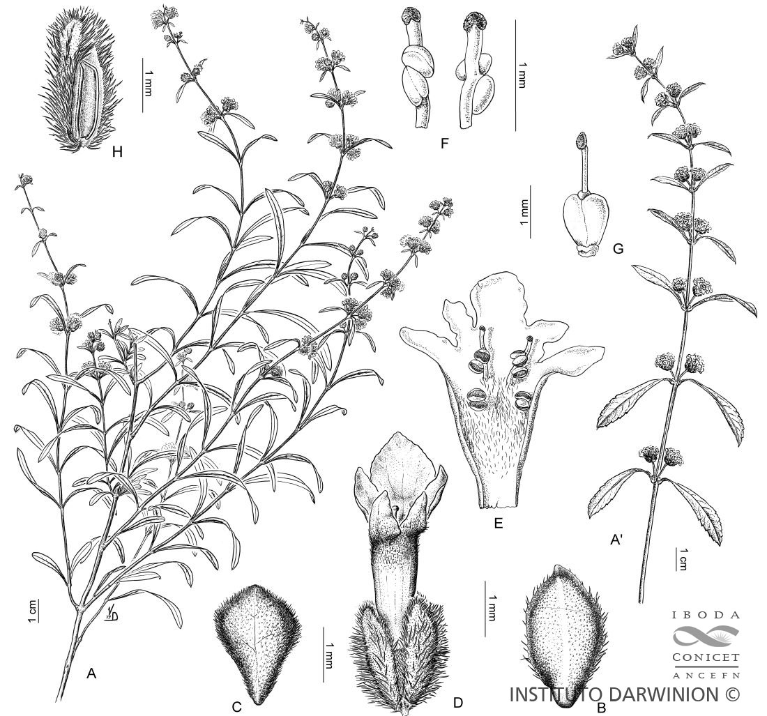A-A’. Ramas. B. Bráctea externa. C. Bráctea interna. D. Flor. E. Corola extendida, vista interna con androceo. F. Estambres con apéndices conectivales, vistas ventral y dorsal . G. Gineceo. H. Clusa cubierta por el cáliz.