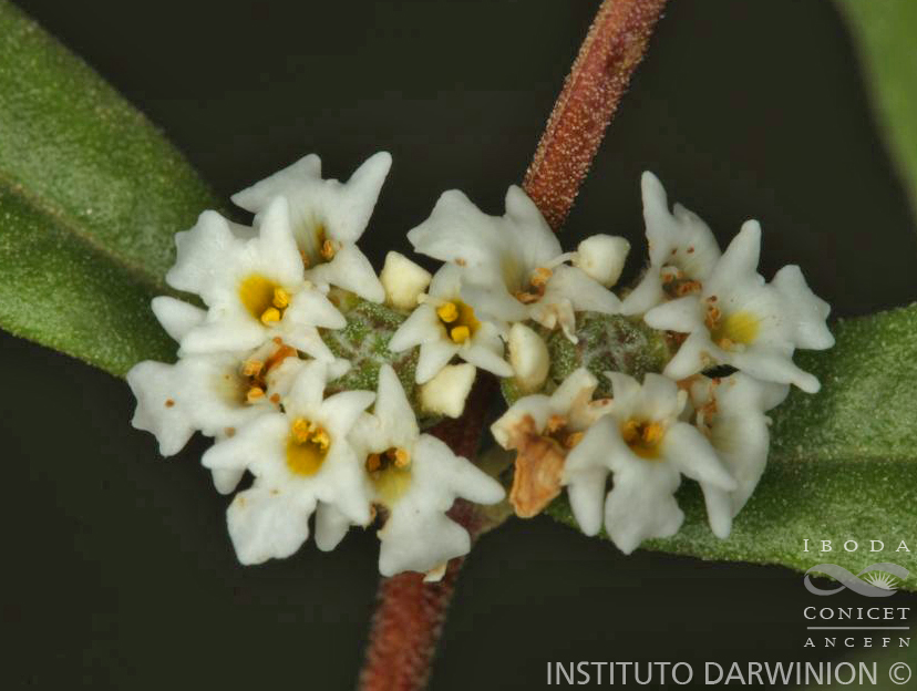 Arbustos aromáticos de 30-100 cm de alto; ramas con corteza pardo-rojiza, exfoliante. Hojas opuestas o algunas veces ternadas; pecíolos de 0,1-7 mm de largo; láminas de 3-45(-70) x 0,5-15 mm, lineares a angostamente oblongas u obovadas, margen entero o dentado en el ápice, a veces revoluto, base aguda u obtusa, ápice agudo u obtuso, cara adaxial ásperoescabrosa, abaxial glandulosa, con nervio central notable. Sinflorescencias en pleiobotrios homotéticos, frondosos; florescencias parciales en espigas capituliformes, 1 ó 2 por axila, subglobosas, de 3,5-10 x 3-10 mm; pedúnculos de 2-13 mm de largo; brácteas imbricadas, las externas generalmente elípticas, de 1-3,5 x 1-2 mm, las internas generalmente obovadas, de 2-3 x 1-2 mm, cóncavas, acuminadas, pubescentes y punteadoresinosas bajo la pubescencia. Cáliz de 1,5-3 mm de largo, tubuloso, hendido en ambas caras, hispídulo y ciliado, persistente y cubriendo a las clusas; corola blanca o blancorosada, de 3-6 mm de largo; estambres adaxiales con apéndices glandulares. Fruto piriforme de 2,1 x 2 mm; clusas con superficie lisa, cara adaxial plana, cara abaxial convexa.