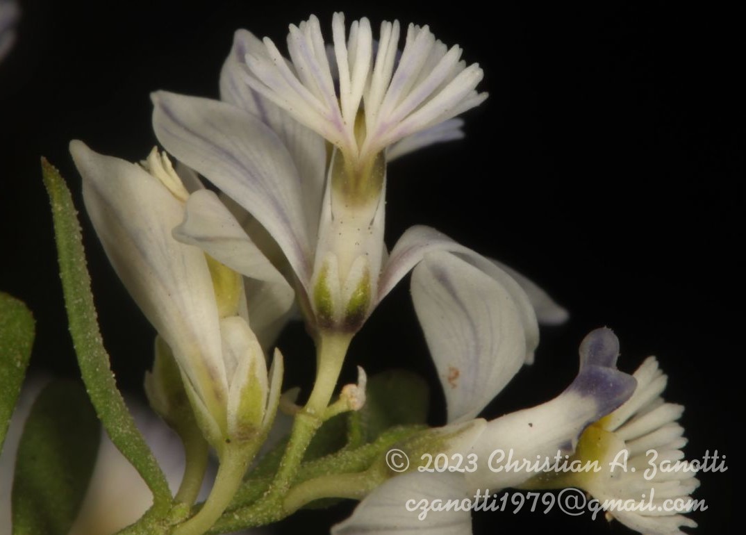 Hierbas postradas, generalmente formando matas compactas, de 5-20 cm de largo; tallos ramificados desde la base y en la porción media, pubérulos con tricomas cortos y curvos. Hojas alternas, sésiles; láminas elípticas a lineares, de 1-8 × 1-1,5 mm, ápice agudo, escasamente pubérulas con tricomas cortos y curvos. Inflorescencias en racimos capituliformes, de 0,5-1 × 1 cm, de 1-6 flores, laxos; brácteas ovado-cuspidadas, ca. 1 × 0,8 mm, ápice agudo, glabras, caducas en la antesis; bractéolas lanceoladas, de 0,5 × 0,1-0,2 mm, ápice agudo, glabras, caducas. Flores de 4,8-6 mm de largo; pedicelos ca. 1 mm de largo, glabros; cáliz blanco con una estría violácea oscura en el medio; sépalos externos glabros; sépalo externo inferior ovado, de 2 × 1-1,5 mm, ápice obtuso o agudo, cóncavo; sépalos externos superiores ovados, de 1,5-1,8 × 0,7-1 mm, ápice agudo, libres; sépalos internos “alas” elípticos, ca. 4 × 1,7 mm, ápice agudo, glabros; corola blanca a violácea; quilla ca. 5 mm de largo, cuña ca. 2 mm de largo, cresta con 20-36 lóbulos; pétalos laterales oblongos, de 4-5 × 1 mm, ápice obtuso, fusionados con la vaina estaminal a través de 1/4 de su margen, con manchas violáceas en el ápice, glabros; estambres 8, vaina estaminal de 2-2,5 mm de largo, glabra, porción libre de los filamentos estaminales menor que el largo de las anteras, ca. 0,4 mm de largo, anteras poricidas; ovario elipsoide, de 1 × 0,5-0,8 mm, simétrico, glabro; estilo curvo en forma de “U”, de 1,6-1,8 mm de largo, área estigmática con el lóbulo estéril terminado en un mechón de tricomas, márgenes glabros, lóbulo fértil sobre un breve soporte. Fruto una cápsula de contorno oblongo, de 3-4 × 2-2,5 mm, simétrica o levemente asimétrica (el margen adaxial a veces mayor), el margen levemente alado, glabra. Semillas cilíndricas, de 3-3,5 × 1 mm, pubescentes, rostro casi nulo; elaiosomas fusionados totalmente o hasta 1/2 de su extensión del largo de la semilla.