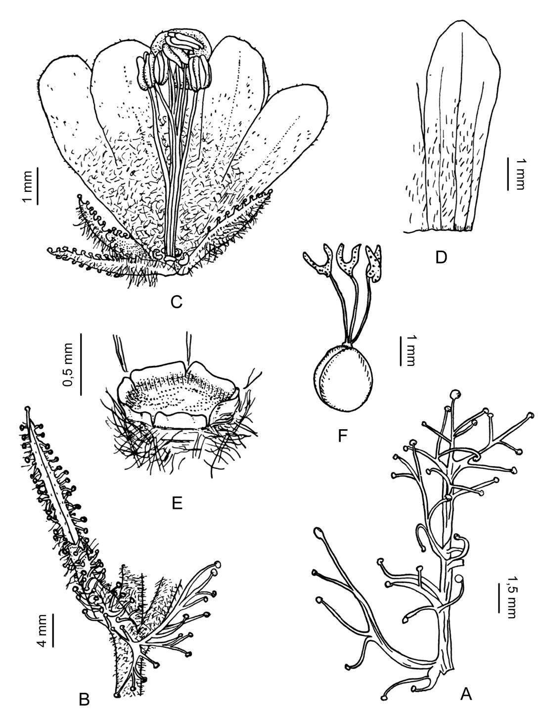 A. Fragmento de la estípula. B. Bráctea floral. C. Flor estaminada abierta. D. Fragmento de la corola de la flor estaminada. E. Disco de la flor estaminada. F. Gineceo. Tomado de Ark. Bot. 3(2): fig. 8. 1955.