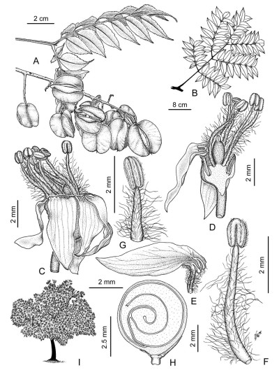 Árboles caducifolios, de 4,5-12 m de alto; tronco ca. 25 cm de diámetro, corteza grisácea; ramas muy jóvenes y ejes de la inflorescencia pubescentes, tricomas simples amarillentos, luego castaño-oscuras, con lenticelas lineares, pubérulas. Hojas con pecíolo de 7-15 cm de largo, pulvinado en la base, canaliculado, glabro a excepción del canal pubescente, lenticelado; láminas de 30-50 × 20-30 cm, con 2-4 pares de folíolos, opuestos o alternos al igual que los foliólulos, paripinnados o imparipinnados; ráquises 2-canaliculados, pubescentes en el canal, el principal de 9,5-28 cm de largo; ráquises secundarios con (2-)4-7 pares de foliólulos; peciólulo de 1-2 mm de largo; foliólulos ovado-angostos, asimétricos, de 38-70 × 14-27 mm, cartáceos, discoloros; base aguda u obtusa, ápice acuminado, margen dentado-serrado; caras adaxial y abaxial glabras, vena media pubérula, prominente en la cara abaxial, a veces axilas sub-barbadas. Inflorescencias en pleiotirsos pedunculados, de 30-50 cm de largo; raquis principal castaño-oscuro, estriado, lenticelado, pubérulo, tricomas simples amarillentos y tricomas glandulares curvos; pedúnculo del cincino de 1,5-4 mm de largo; pedicelo floral de 2-4 mm de largo, en el fruto de 4-5 mm de largo, articulado en la base; piloso, tricomas simples y glandulares curvos con contenido anaranjado; brácteas triangulares, de 1 mm de largo, bractéolas ovadas, de 0,5 mm de largo, ambas pubescentes. Flores de 6-6,5 mm de largo, fragantes; sépalos parcialmente soldados, lóbulos ovados, de 1,2-1,8(-2) mm de largo, ciliado-glandulares, persistentes; pétalos con lámina de 6-7 mm de largo, uña de 1,50-1,66 mm de largo, éstas conniventes delimitan un pseudo-tubo que acumula el néctar; disco nectarífero en forma de dedal lobado, ca. 1 mm de alto que oculta el androginóforo; estambres con anteras pubérulas en la flor estaminada 4,5-6 mm de largo, filamentos con tricomas largos y rectos sobre todo en 1/2 basal, en la flor pistilada ca. 3 mm de largo, pubescentes; pistilodio elipsoide, ca. 2 mm, velloso; gineceo ca. 4 mm de largo, ovario 3-lobado-ovoide, velloso, tricomas adpresos, estilo y estigma rojizos de igual longitud, en total de 1,5-2,5 mm de largo, el estilo persiste en el fruto. Frutos cápsulas cartáceas, de contorno suborbicular, de 32-43 × 29-40 mm, 3-gono-3-lobadas, septo angosto, rosadas virando a castaño-amarillentas cuando maduras, la dehiscencia comienza por el ápice; epicarpo glabro o pubérulo, tricomas simples escasos, endocarpo glabro. Semillas subesféricas, con tegumento crustáceo y liso, castaño-oscuras, de 6 × 5 mm de diámetro.