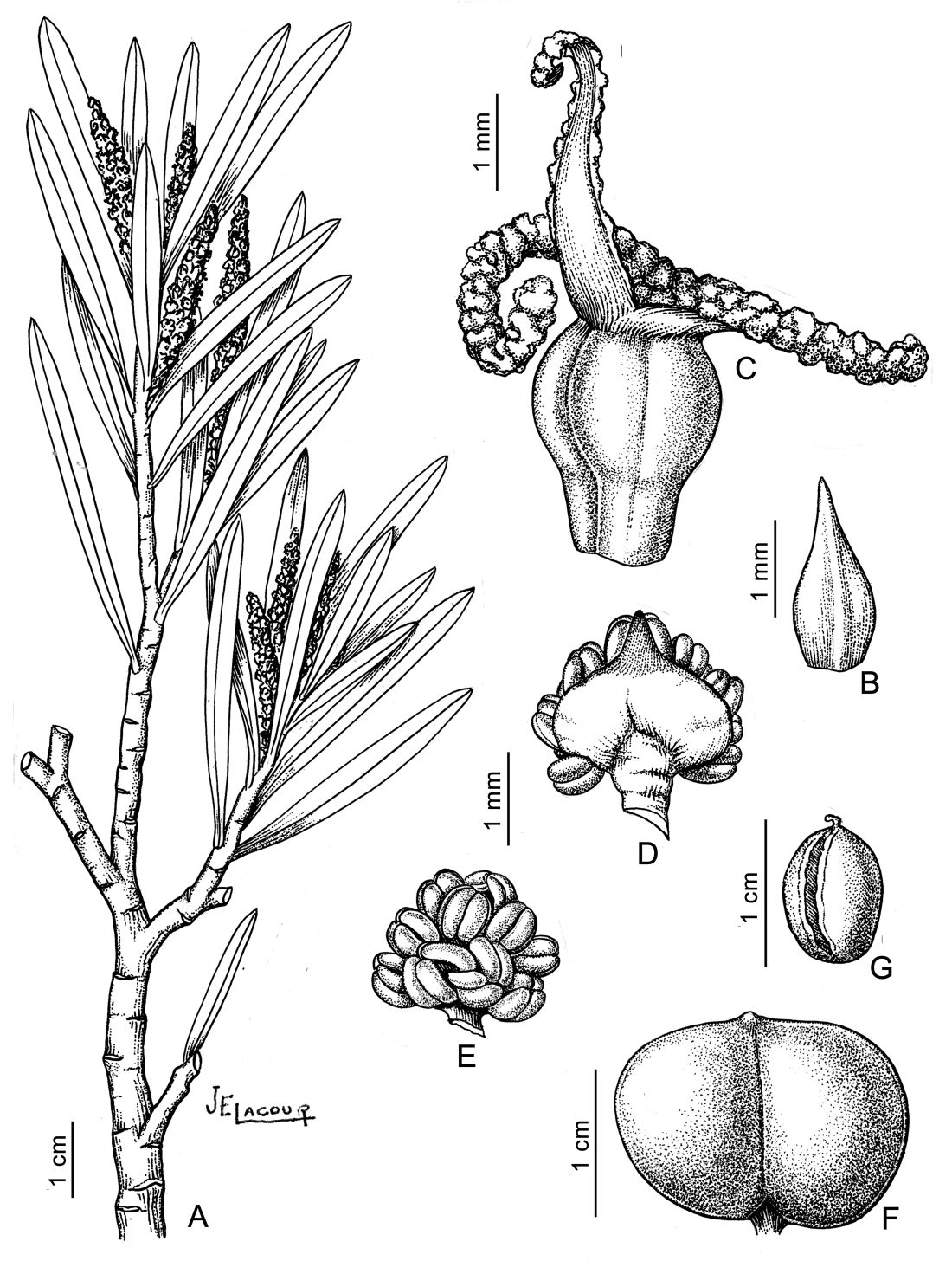A. Rama florífera. B. Bráctea de la flor pistilada. C. Flor pistilada. D. Flor estaminada con bráctea (cara externa). E. Flor estaminada sin bráctea (cara interna). F. Fruto. G. Semilla.