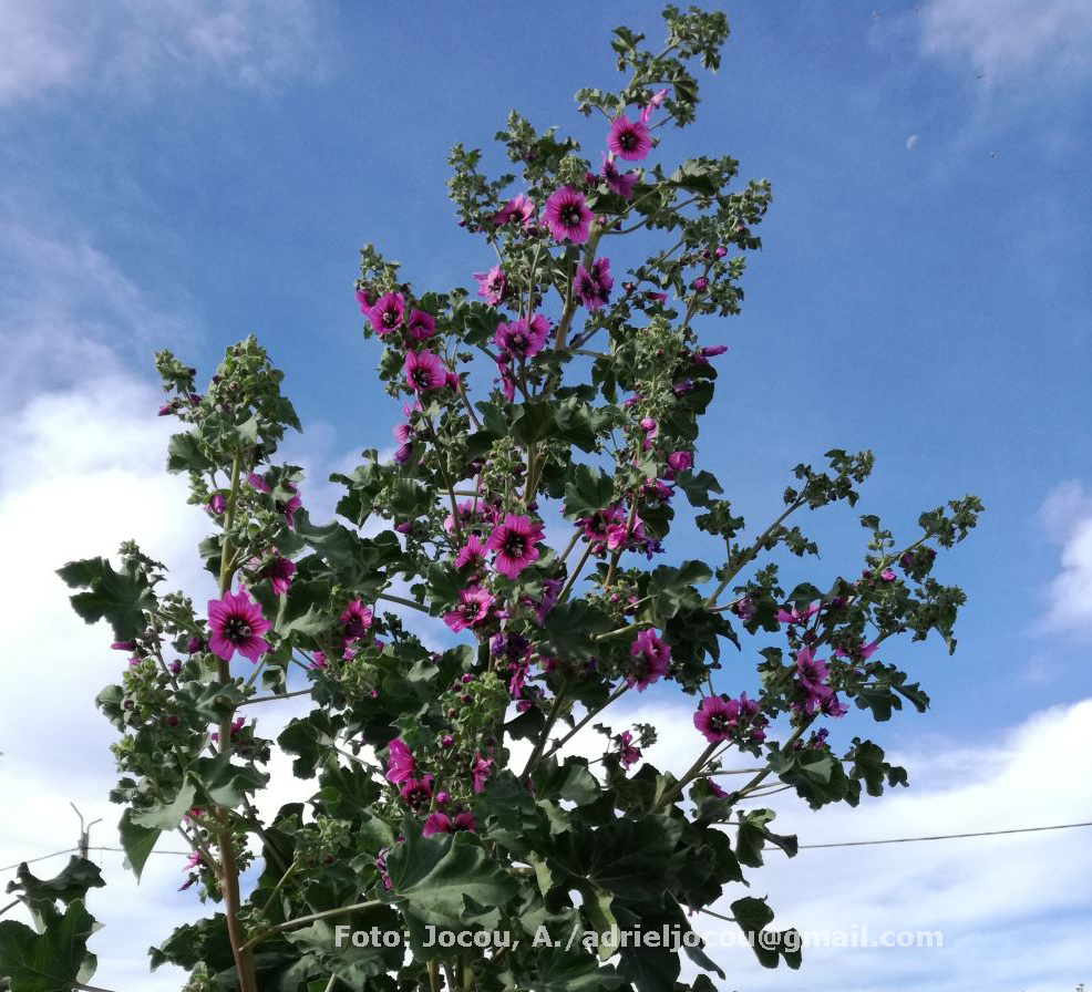 Hierba bienal, de 1-3 m de altura. Ramas jóvenes con pelos estrellados que dejan ver la epidermis. Estípulas de 4 × 1,5 mm, triangulares, con el margen pubescente. Pecíolos hasta 10 cm, densamente pubescentes hacia el lado interno. Lámina de 7 × 8 cm, suborbicular o reniforme, 5-7-lobada, crenada, ambas caras cubiertas de pelos estrellados finos, esparcidos. Glomérulos axilares con 3-12 flores, raro flores sobre un corto eje común. Pedúnculos hasta 2 cm. Calículo de 3 bractéolas de 7 × 5 mm, suborbiculares, obtusas, soldadas entre sí 1,5 mm en la base, notablemente acrescentes, cubiertas de pelos cortos que dejan ver la epidermis y con pelos más largos hacia el margen. Cáliz de 5 mm, acrescente, pubescente. Pétalos de 20 mm, liláceos. Fruto con 7 mericarpos y con el resto del estilo prominente en el centro, cubierto por los lóbulos del cáliz y rodeado por 3 bractéolas muy desarrolladas y extendidas. Mericarpos de 4 × 4 mm, glabros, levemente reticulados, indehiscentes. [Subarbusto, de 1 m o más de alto. Láminas hasta de 15 cm, orbiculares a levemente 5-7 lobadas, palmadas, lóbulos obtusos, con pubescencia fina, margen crenado, base cordada; pecíolos más largosque las láminas. Flores cortamente pediceladas, usualmente en grupos axilares; brácteas del calículo de 8 × 5-6 mm, anchamente ovadas, agudas u obtusas, con pelos estrellados. Cáliz de 3-4 mm, densamente pubescente. Corola color lavanda con la base y venas purpúreo-oscuras, ápice emarginado. Columna estaminal de 8-10 mm, ápice pubescente, glabro hacia la base; filamentos de 2 mm. Ovario con cerca de 8 estilos. Frutos de 8-10 mm de diámetro, formado por cerca de 8 mericarpos, glabros o pubescentes, con paredes dorsales y laterales rugosas.]