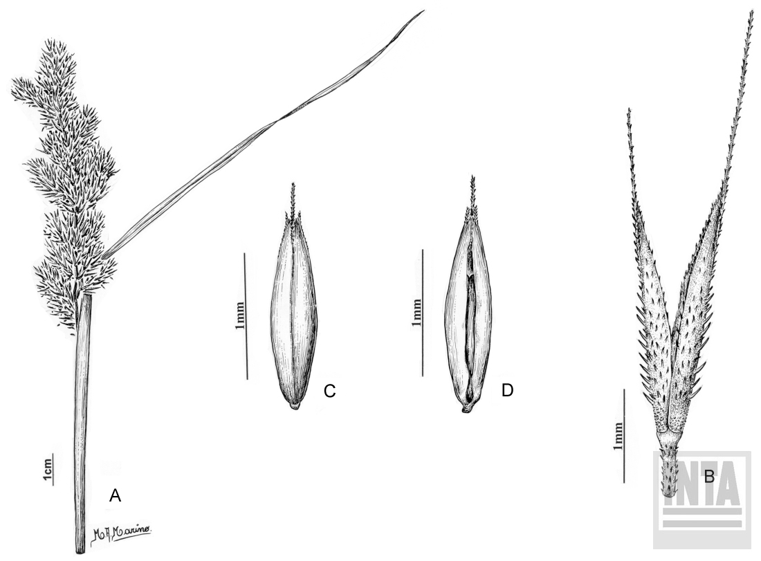A, inflorescencia; B, espiguilla; C, antecio, vista dorsal; D, antecio, vista ventral.