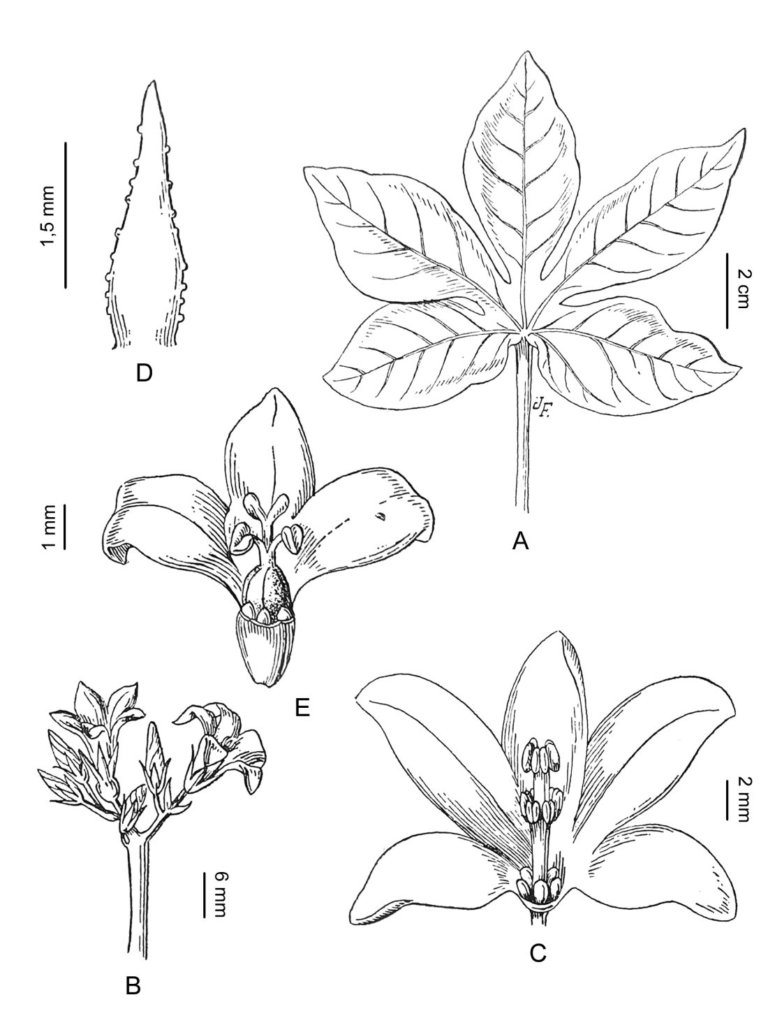 A. Hoja. B. Porción de la inflorescencia. C. Flor estaminada. D. Sépalo de la flor estaminada. E. Flor pistilada. Tomado de Lilloa 9: fig. 16. 1942.