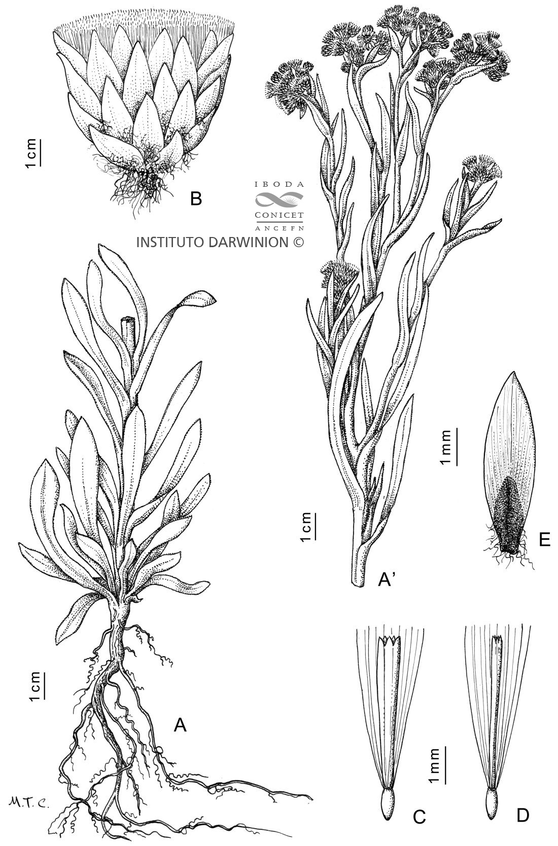 A, A’. Planta. B. Capítulo. C. Flor del centro. D. Flor del margen. E. Filario interno.