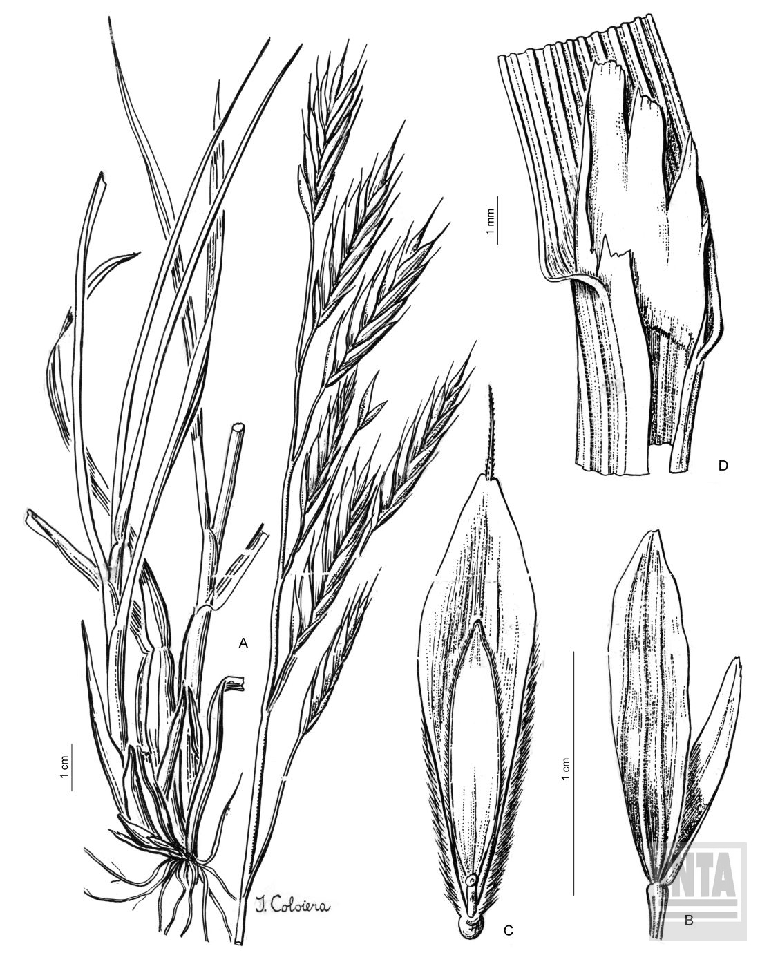 Se distingue de la variedad tipo por presentar láminas foliares planas, de 2-4 mm de ancho y espiguillas mayores de 25 mm de largo. Además, la lemma del antecio basal es mayor de 16 mm de largo, con sus márgenes fuertemente pilosos.