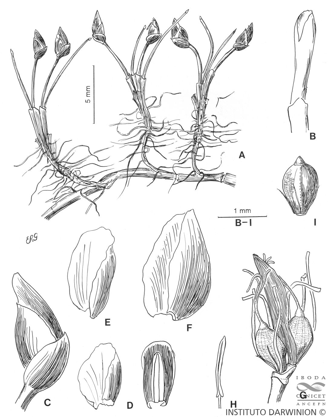 A. Planta. B. Ápice de la vaina. C. Espiguilla. D. Gluma basal de la espiguilla, vista ventral y dorsal, respectivamente. E. Segunda gluma. F. Tercera gluma. G. Espiguilla sin glumas con dos aquenios. H. Antera. I. Aquenio.