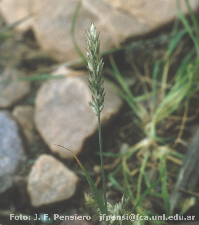 Plantas perennes, cespitosas, de 15-45 cm de altura, con engrosamientos bulbiformes subterráneos que contienen flores cleistógamas encerradas por brácteas; vainas pubescentes, aquilladas; lígulas pilosa, de 0,5 mm de largo; láminas planas o convolutas, pubescentes, angostas, de 5-12 x 0,1-0,2 cm. Inflorescencia en panoja contraída, subespiciforme, generalmente densa, de 3-12 cm de largo, verde oscuro o a veces algo negruzcas. Espiguillas cortamente pediceladas, 3-6-floras, de 5-7 x 1,2-1,6 mm, antecios inferiores 1-2 perfectos, los superiores estaminados o asexuados y reducidos; glumas 2, membranáceas, 3-5-7-nervias, de 3-6 mm de largo, la inferior ligeramente menor que la superior, ambas de ápice agudo; lemma del antecio basal papirácea, pilosa en el margen y hacia la base, dorso redondeado, cuerpo de 2,1-2,5 mm de largo, 9-nervia, con los nervios prolongados en 9 aristas mayores que el cuerpo de la lemma, de 3-4,2 mm de largo, aristas ciliadas en la mitad inferior y escabrosas hacia el ápice; pálea bicarinada, hialina, poco menor que su lemma, de 2-2,4 mm de largo, ciliada sobre las quillas; anteras de 0,2-0,5 mm de largo; cariopsis ovada, algo comprimida dorsiventralmente, no surcada, de 1,1-1,3 mm de largo, mácula embrional casi tan larga como el fruto, hilo oval-punctiforme.