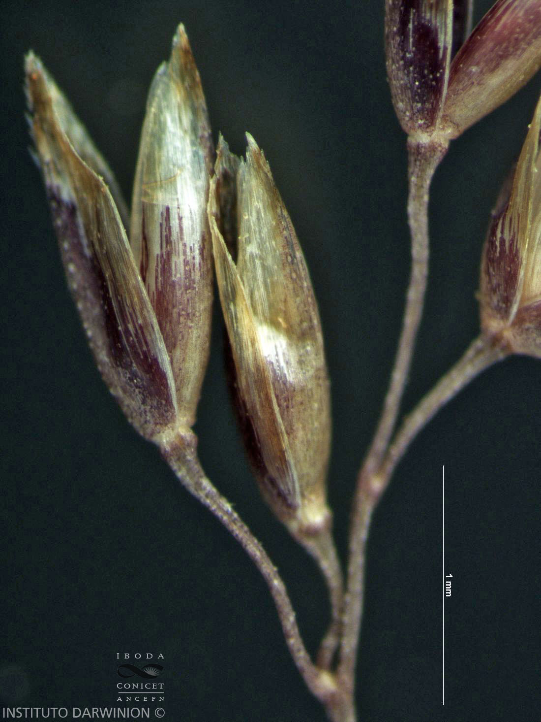 Hierbas perennes de 10-80 cm de alto, rizomas breves, estolones desarrollados; cañas simples o ramificadas, erectas o decumbentes en la base, nudos 2-5, glabros, castaños; césped corto o acompañando a las cañas floríferas; caña y raquis de la inflorescencia glabros o escabriúsculos; vainas de 2-11 cm de largo, glabras o escabriúsculas; lígulas 0,2-2 mm de largo, las de las innovaciones de 0,2-0,5 mm de largo, truncadas, membranáceas, borde eroso, a veces laciniadas; láminas de 1-17 cm x 1-4 mm, planas o convolutas al secarse, glabras o escabriúsculas. Inflorescencia de 3-20 x 2,5-8 cm, ovoide, piramidal, verde o purpúrea, exerta, laxa, ramificaciones laterales patentes, excepcionalmente contraídas, verticiladas, 3-4 por verticilo, desnudas en la base; pedicelos de las espiguillas menores de 2 mm de largo, no dilatados hacia la porción distal, glabros o escabriúsculos. Espiguillas 2(-2,5) mm de largo; glumas 2, subiguales, la inferior apenas más larga que la superior, 1-nervias, carinadas, carina escabrosa en la mitad superior, carina de la gluma superior generalmente glabra, dorso glabro, ápice agudo, múticas; callo breve, glabro o piloso, con 2 mechoncitos de escasos pelos cortos; antecio ?-¾ de la longitud de las glumas; lemma de 1,5-2,1 mm de largo, membranácea, hialina, glabra, ápice obtuso o apenas truncado, 3-5-nervia, 3-5-denticulada, mútica, mucronada o con arístula tenue; pálea de 0,7-1 mm de largo, membranácea, hialina, 2-nervia, 2-carinada, surcada longitudinalmente, glabra, ápice escotado o 2-partido; lodículas 2, de 0,2 mm hasta ca. ½ de la longitud de la pálea, lanceoladas-lineares, hialinas; anteras de 1-1,5 mm de largo; cariopsis de 1-1,5 mm de largo; hilo oval.