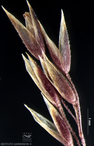 Hierbas perennes de (21-)33-64 cm de alto, cespitosas; innovaciones extravaginales; cañas simples, erectas, subgeniculadas en la base; nudos 3-5; césped formado por hojas generalmente filiformes de menor longitud que ½ del largo de las cañas, mezcladas con hojas planas que llegan hasta la inflorescencia; caña florífera y raquis glabros; vainas glabras, estriadas de 6-15 cm de largo; lígulas de 3-5 mm de largo, las de las innovaciones de 0,6-2,5 mm de largo, membranáceas, triangulares a truncadas, ápice obtuso, eroso a menudo fimbriado; láminas de 6-15 cm x 2-3,5 mm, planas, convolutas, tiernas, glabras, de ápice agudo. Inflorescencia de (3,5-)10-22 x 2-11 cm, generalmente violácea, verdosa o castaña, laxa, ramificaciones laterales verticiladas, ramificadas por debajo de la mitad, ascendentes, 2-3-cótomas, sin espiguillas hacia la base; pedicelos de las espiguillas de 1-4,5 mm de largo, glabros, patentes, separando las espiguillas entre sí. Espiguillas de (2-)2,5-3 mm de largo; glumas 2, desiguales, la inferior ligeramente más larga que la superior, aguda, 1-nervias, múticas, carinadas, escabrosas en la mitad superior; callo breve, con 2 mechoncitos laterales de pelos cortos y escasos; antecio generalmente de 1-1,5 mm menor que las glumas; lemma de 1,5-2 mm de largo, membranácea, hialina, 5-nervia, ápice agudo a más o menos truncado, mútica, mucronada o a veces con arístula de 1,4(-1,9) mm de largo, inserta a 0,6(-1) mm del ápice; pálea de 0,2-0,5 mm de largo, escuamiforme, hialina, enervia, difícil de observar; lodículas 2, lineares ca. igual longitud que la pálea; anteras de 0,7-1 mm de largo; cariopsis de 1 mm de largo, castaña, surco ventral profundo; mácula embrional pequeña, hilo angostamente elíptico, notable, endosperma farináceo o semilíquido.