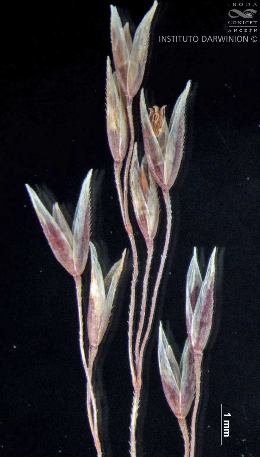 Hierbas perennes de (21-)33-64 cm de alto, cespitosas; innovaciones extravaginales; cañas simples, erectas, subgeniculadas en la base; nudos 3-5; césped formado por hojas generalmente filiformes de menor longitud que ½ del largo de las cañas, mezcladas con hojas planas que llegan hasta la inflorescencia; caña florífera y raquis glabros; vainas glabras, estriadas de 6-15 cm de largo; lígulas de 3-5 mm de largo, las de las innovaciones de 0,6-2,5 mm de largo, membranáceas, triangulares a truncadas, ápice obtuso, eroso a menudo fimbriado; láminas de 6-15 cm x 2-3,5 mm, planas, convolutas, tiernas, glabras, de ápice agudo. Inflorescencia de (3,5-)10-22 x 2-11 cm, generalmente violácea, verdosa o castaña, laxa, ramificaciones laterales verticiladas, ramificadas por debajo de la mitad, ascendentes, 2-3-cótomas, sin espiguillas hacia la base; pedicelos de las espiguillas de 1-4,5 mm de largo, glabros, patentes, separando las espiguillas entre sí. Espiguillas de (2-)2,5-3 mm de largo; glumas 2, desiguales, la inferior ligeramente más larga que la superior, aguda, 1-nervias, múticas, carinadas, escabrosas en la mitad superior; callo breve, con 2 mechoncitos laterales de pelos cortos y escasos; antecio generalmente de 1-1,5 mm menor que las glumas; lemma de 1,5-2 mm de largo, membranácea, hialina, 5-nervia, ápice agudo a más o menos truncado, mútica, mucronada o a veces con arístula de 1,4(-1,9) mm de largo, inserta a 0,6(-1) mm del ápice; pálea de 0,2-0,5 mm de largo, escuamiforme, hialina, enervia, difícil de observar; lodículas 2, lineares ca. igual longitud que la pálea; anteras de 0,7-1 mm de largo; cariopsis de 1 mm de largo, castaña, surco ventral profundo; mácula embrional pequeña, hilo angostamente elíptico, notable, endosperma farináceo o semilíquido.