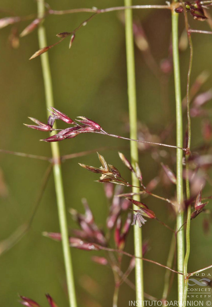 Hierbas perennes de (21-)33-64 cm de alto, cespitosas; innovaciones extravaginales; cañas simples, erectas, subgeniculadas en la base; nudos 3-5; césped formado por hojas generalmente filiformes de menor longitud que ½ del largo de las cañas, mezcladas con hojas planas que llegan hasta la inflorescencia; caña florífera y raquis glabros; vainas glabras, estriadas de 6-15 cm de largo; lígulas de 3-5 mm de largo, las de las innovaciones de 0,6-2,5 mm de largo, membranáceas, triangulares a truncadas, ápice obtuso, eroso a menudo fimbriado; láminas de 6-15 cm x 2-3,5 mm, planas, convolutas, tiernas, glabras, de ápice agudo. Inflorescencia de (3,5-)10-22 x 2-11 cm, generalmente violácea, verdosa o castaña, laxa, ramificaciones laterales verticiladas, ramificadas por debajo de la mitad, ascendentes, 2-3-cótomas, sin espiguillas hacia la base; pedicelos de las espiguillas de 1-4,5 mm de largo, glabros, patentes, separando las espiguillas entre sí. Espiguillas de (2-)2,5-3 mm de largo; glumas 2, desiguales, la inferior ligeramente más larga que la superior, aguda, 1-nervias, múticas, carinadas, escabrosas en la mitad superior; callo breve, con 2 mechoncitos laterales de pelos cortos y escasos; antecio generalmente de 1-1,5 mm menor que las glumas; lemma de 1,5-2 mm de largo, membranácea, hialina, 5-nervia, ápice agudo a más o menos truncado, mútica, mucronada o a veces con arístula de 1,4(-1,9) mm de largo, inserta a 0,6(-1) mm del ápice; pálea de 0,2-0,5 mm de largo, escuamiforme, hialina, enervia, difícil de observar; lodículas 2, lineares ca. igual longitud que la pálea; anteras de 0,7-1 mm de largo; cariopsis de 1 mm de largo, castaña, surco ventral profundo; mácula embrional pequeña, hilo angostamente elíptico, notable, endosperma farináceo o semilíquido.