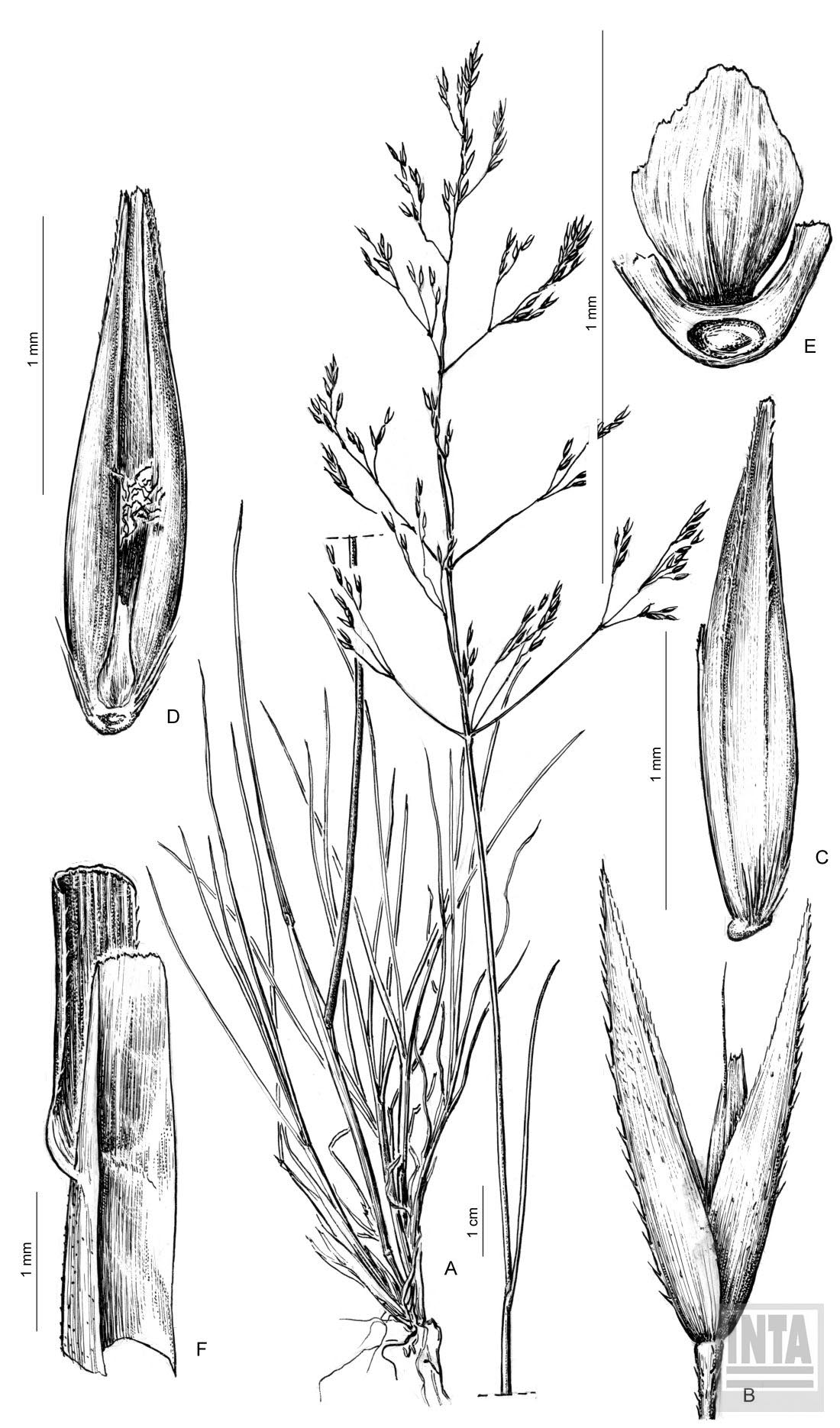 Hierbas perennes de (21-)33-64 cm de alto, cespitosas; innovaciones extravaginales; cañas simples, erectas, subgeniculadas en la base; nudos 3-5; césped formado por hojas generalmente filiformes de menor longitud que ½ del largo de las cañas, mezcladas con hojas planas que llegan hasta la inflorescencia; caña florífera y raquis glabros; vainas glabras, estriadas de 6-15 cm de largo; lígulas de 3-5 mm de largo, las de las innovaciones de 0,6-2,5 mm de largo, membranáceas, triangulares a truncadas, ápice obtuso, eroso a menudo fimbriado; láminas de 6-15 cm x 2-3,5 mm, planas, convolutas, tiernas, glabras, de ápice agudo. Inflorescencia de (3,5-)10-22 x 2-11 cm, generalmente violácea, verdosa o castaña, laxa, ramificaciones laterales verticiladas, ramificadas por debajo de la mitad, ascendentes, 2-3-cótomas, sin espiguillas hacia la base; pedicelos de las espiguillas de 1-4,5 mm de largo, glabros, patentes, separando las espiguillas entre sí. Espiguillas de (2-)2,5-3 mm de largo; glumas 2, desiguales, la inferior ligeramente más larga que la superior, aguda, 1-nervias, múticas, carinadas, escabrosas en la mitad superior; callo breve, con 2 mechoncitos laterales de pelos cortos y escasos; antecio generalmente de 1-1,5 mm menor que las glumas; lemma de 1,5-2 mm de largo, membranácea, hialina, 5-nervia, ápice agudo a más o menos truncado, mútica, mucronada o a veces con arístula de 1,4(-1,9) mm de largo, inserta a 0,6(-1) mm del ápice; pálea de 0,2-0,5 mm de largo, escuamiforme, hialina, enervia, difícil de observar; lodículas 2, lineares ca. igual longitud que la pálea; anteras de 0,7-1 mm de largo; cariopsis de 1 mm de largo, castaña, surco ventral profundo; mácula embrional pequeña, hilo angostamente elíptico, notable, endosperma farináceo o semilíquido.